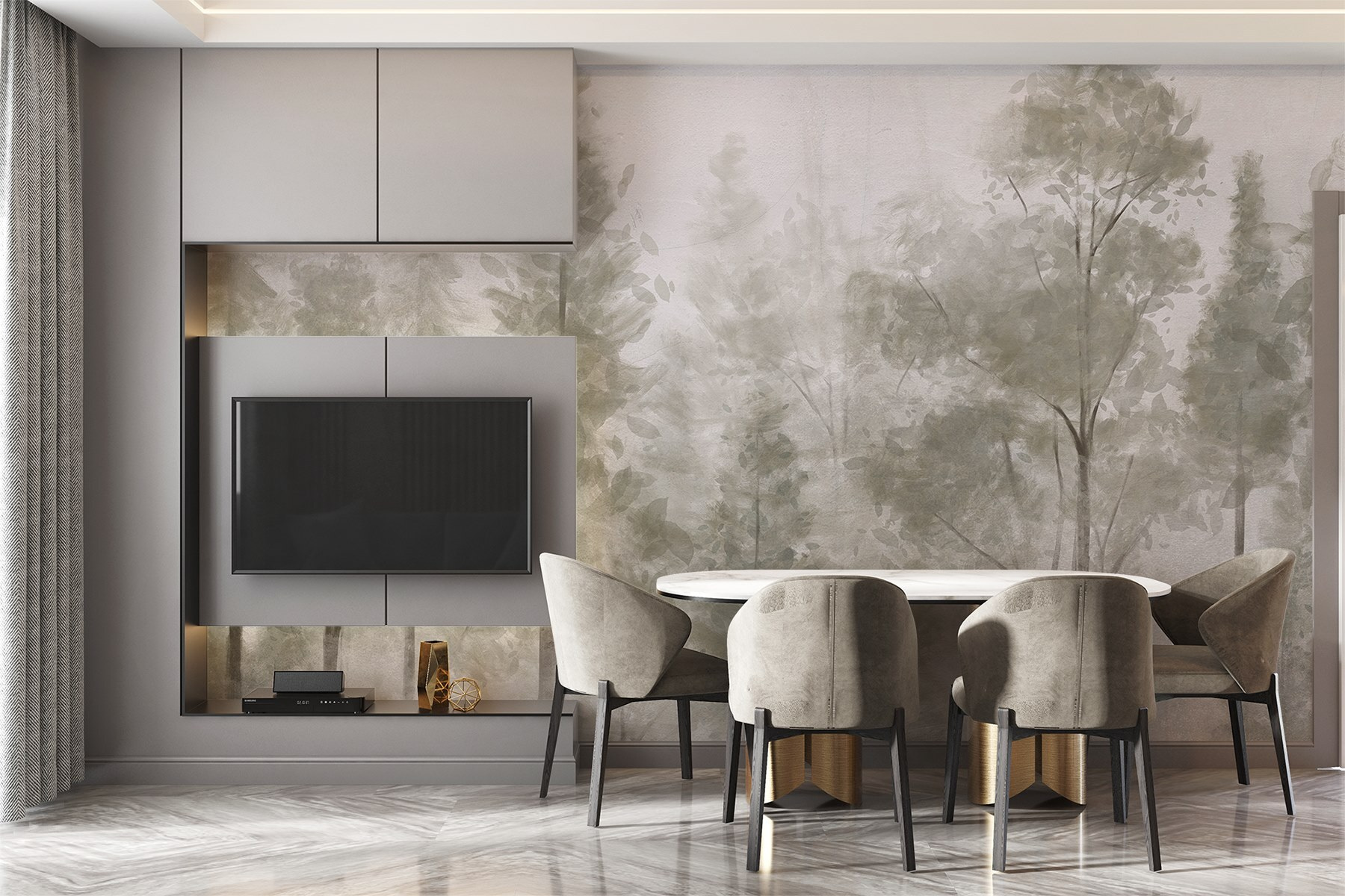Les teintes douces de vert et de gris créent une atmosphère paisible et s’adaptent parfaitement à différents styles de décoration. Imaginez que vous sirotiez votre café du matin en contemplant cette scène paisible – qui a besoin d’une cabane dans les bois quand on peut avoir ça ? Laissez les murmures de la nature envahir votre espace, et peut-être même susciter quelques rêveries. Ce n’est pas seulement un décor, c’est une évasion quotidienne.