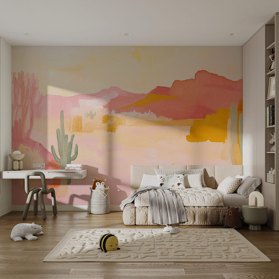 Imaginez transformer votre chambre en une oasis de sérénité grâce à cette superbe peinture murale. Représentant un paysage de rêve baigné de teintes chaudes de rose et de jaunes doux, il invite à des vibrations apaisantes qui vous donnent l’impression de vous promener dans un désert éclairé par le soleil au crépuscule. Imaginez un coin confortable où vous siroteriez votre café en rêvant à des voyages spontanés. Les cactus enjoués et les collines ondulantes apportent de la vie et de la chaleur, transformant vos murs en une toile de la beauté de la nature. C’est comme si vous aviez une fenêtre sur la nature dans votre maison, sans le sable dans vos chaussures ! Parfait pour tous ceux qui souhaitent une touche de tranquillité dans leur espace.