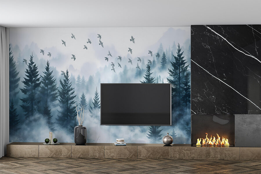 Transformez votre espace avec la peinture murale “Oiseaux volant au-dessus d’une forêt” – une évasion sereine dans votre salon. Imaginez que vous entrez et que vous êtes accueilli par une forêt brumeuse, où les oiseaux s’envolent parmi les grands arbres. C’est comme entrer dans un conte de fées !