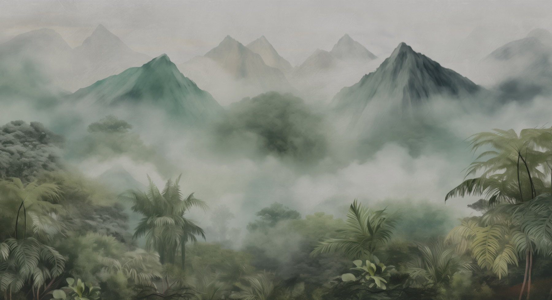 Transform your space into a tranquil escape with this stunning “Foggy Landscape with Mountains and Trees” mural. Imagine sinking into your couch while gazing at misty mountains that seem to whisper secrets of the wilderness. The lush greenery brings a slice of the jungle right into your living room—perfect for daydreaming or planning your next adventure.