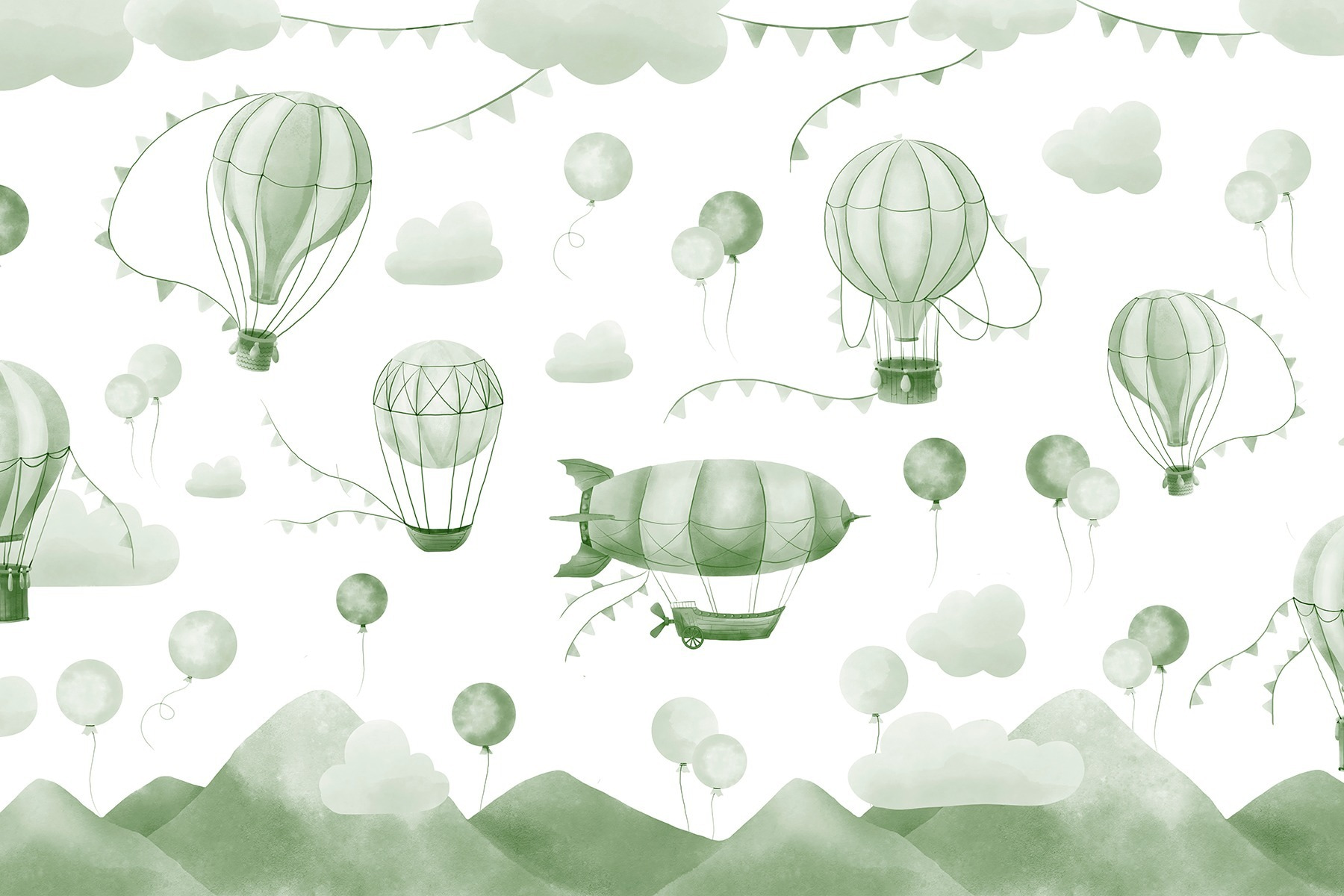 Transformez votre espace avec cette délicieuse peinture murale présentant un mélange fantaisiste de ballons verts et de douces silhouettes de montagnes. C’est comme si vous entriez dans un rêve ou dans un joyeux monde de dessins animés où les montgolfières flottent paresseusement dans le ciel, apportant un sentiment d’émerveillement et d’aventure. Imaginez une pièce confortable éclairée par ces teintes douces, une invitation à la paix intérieure et à la rêverie. C’est une invitation à la paix intérieure et à la rêverie. C’est parfait pour les enfants ou les jeunes de cœur. Regarder ces ballons s’élever peut susciter la joie et la nostalgie, nous rappelant des journées ensoleillées remplies de rires et d’explorations. Cette peinture murale pourrait être la toile de fond idéale pour l’heure du conte ou simplement pour un moment de calme en sirotant un thé. Ce n’est pas seulement un décor, c’est une petite évasion heureuse !