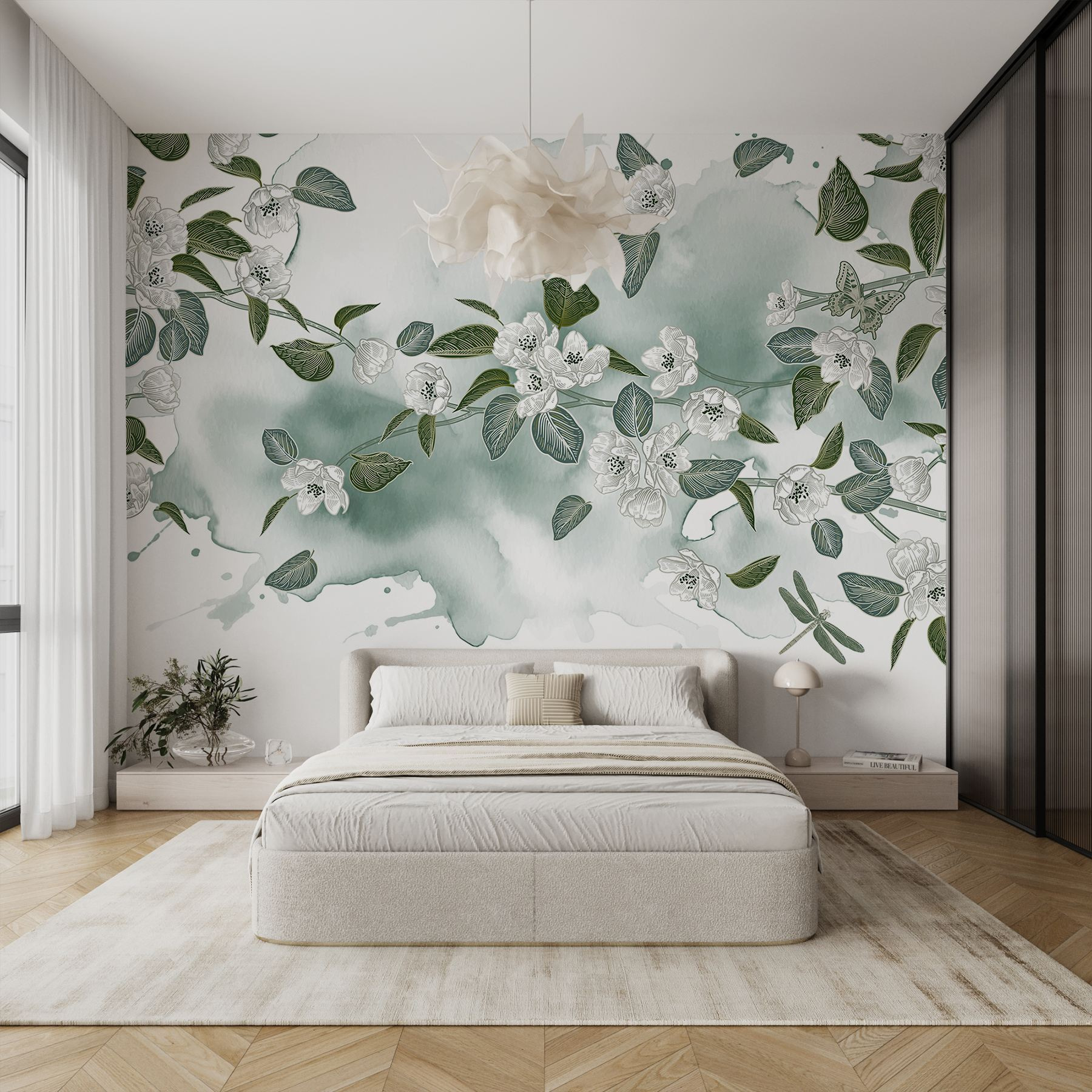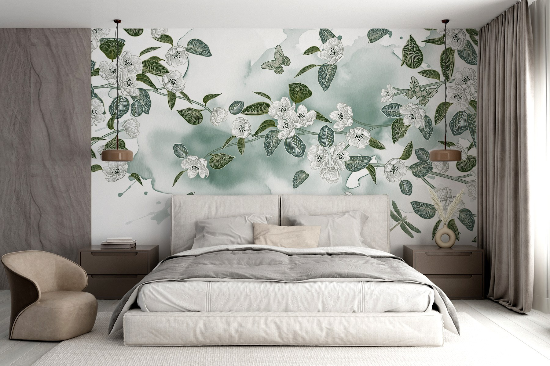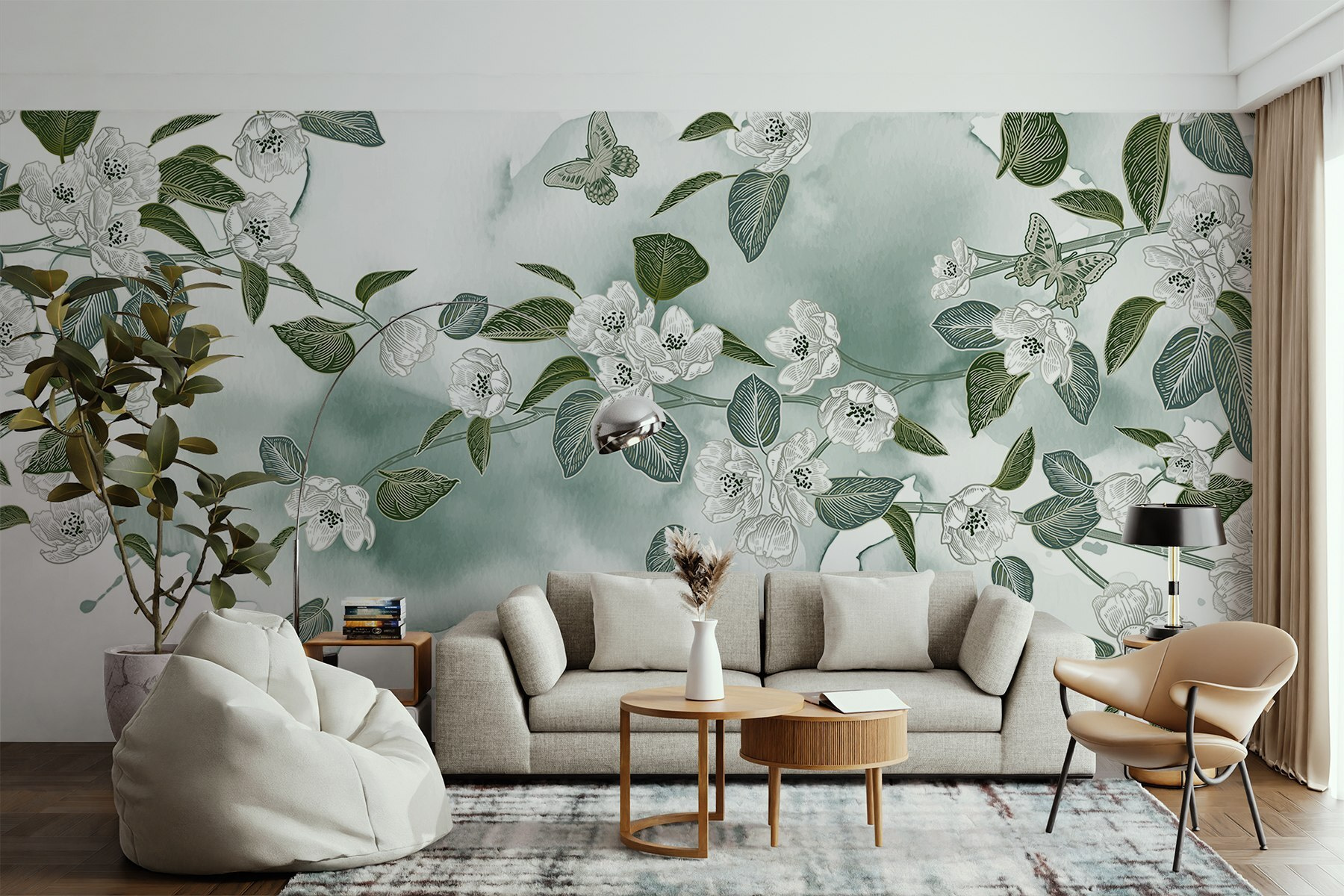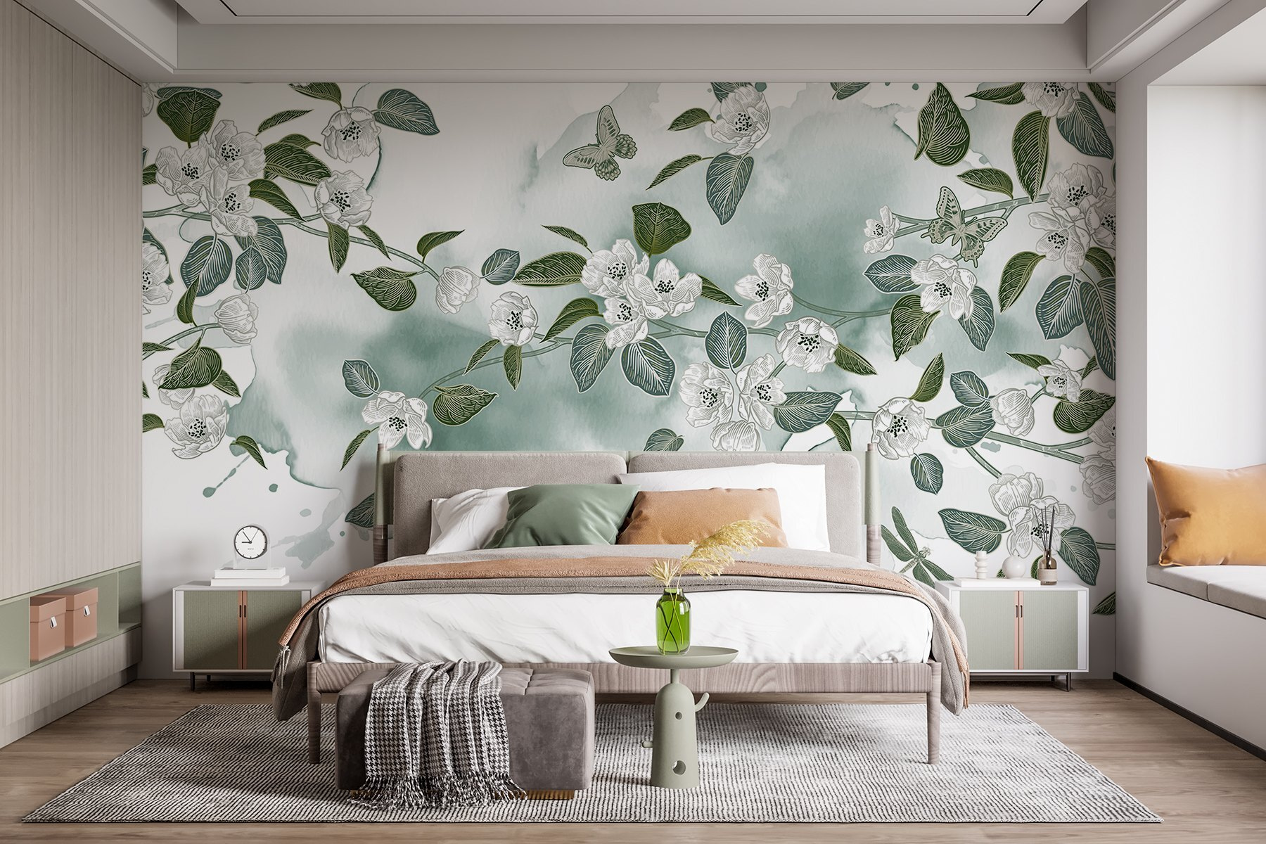 Transform your space with this enchanting mural of white flowers and lush green leaves, all splashed against a soft white background. It’s like your walls decided to throw a garden party, inviting nature right into your home. Imagine sipping coffee while butterflies seem to flutter around you (okay, maybe not literally, but it feels that way). This watercolor design adds a calming vibe, perfect for cozy living rooms or tranquil bedrooms. It’s refreshing, elegant, and slightly whimsical—a conversation starter for sure! Plus, who wouldn’t want to wake up to a burst of floral joy every day?