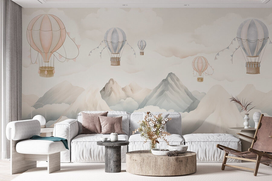 Imaginez que vous pénétrez dans un monde où des montgolfières dérivent paresseusement au-dessus de montagnes majestueuses, entourées de nuages doux et gonflés. Cette peinture murale apporte une ambiance sereine à n’importe quel espace, comme si vous regardiez par la fenêtre un paysage de rêve. Imaginez un coin confortable où vous siroteriez votre café du matin, inspiré par l’aventure qui vous attend juste derrière vos murs. Les douces couleurs pastel invitent à la chaleur et au calme, ce qui est parfait pour une chambre d’enfant ou un espace de vie décontracté. C’est le genre de peinture murale qui fait naître des rêves et vous invite à savourer les joies simples de la vie, comme celle de flotter dans les cieux.