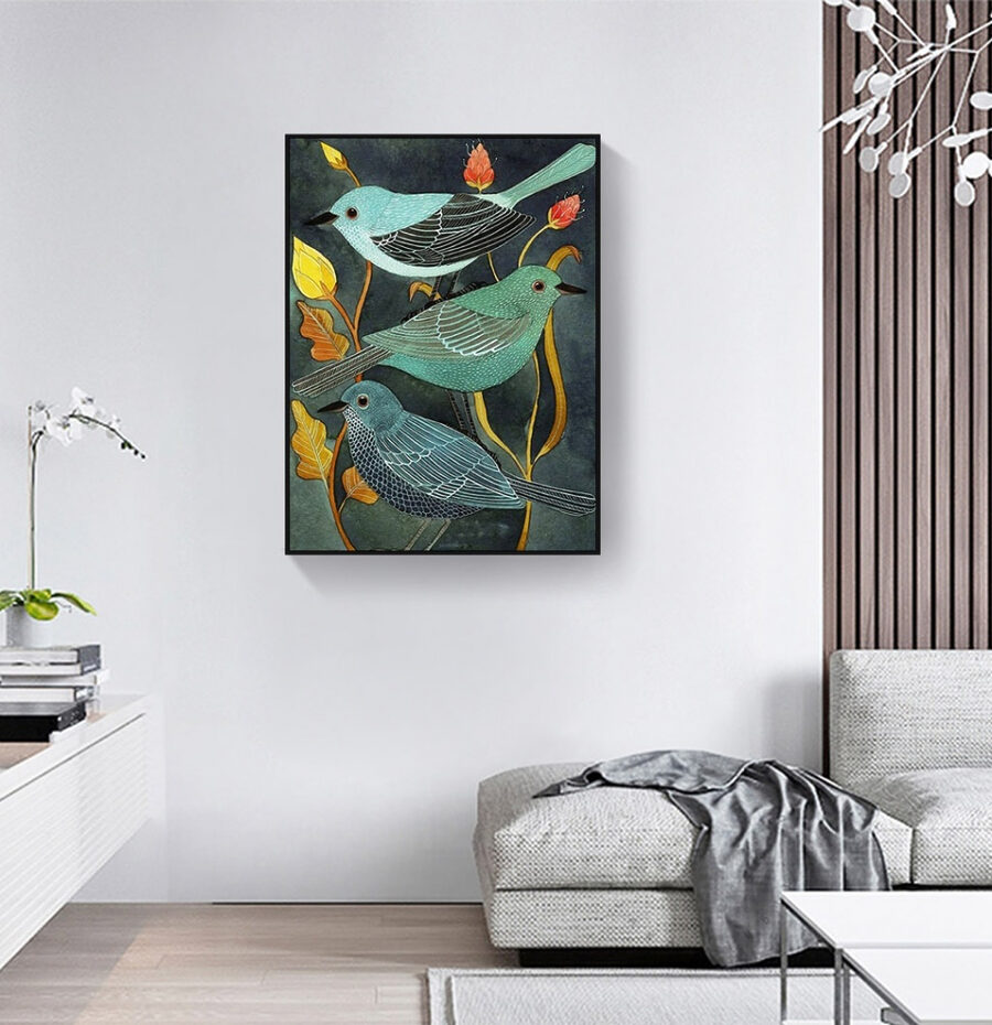 Imaginez que vous entrez dans votre salon et que la première chose que vous voyez est cette délicieuse explosion de couleurs et de charme. Le tableau “Trois oiseaux parmi des plantes colorées” est justement cette petite étincelle de joie dont votre espace pourrait avoir besoin ! Avec ces trois adorables oiseaux perchés au milieu d’un feuillage vibrant, presque fantaisiste, c’est comme si la nature avait décidé de venir prendre le thé. Le mélange de bleus, de verts et de touches d’orange donne l’impression d’une promenade dans un jardin ensoleillé.