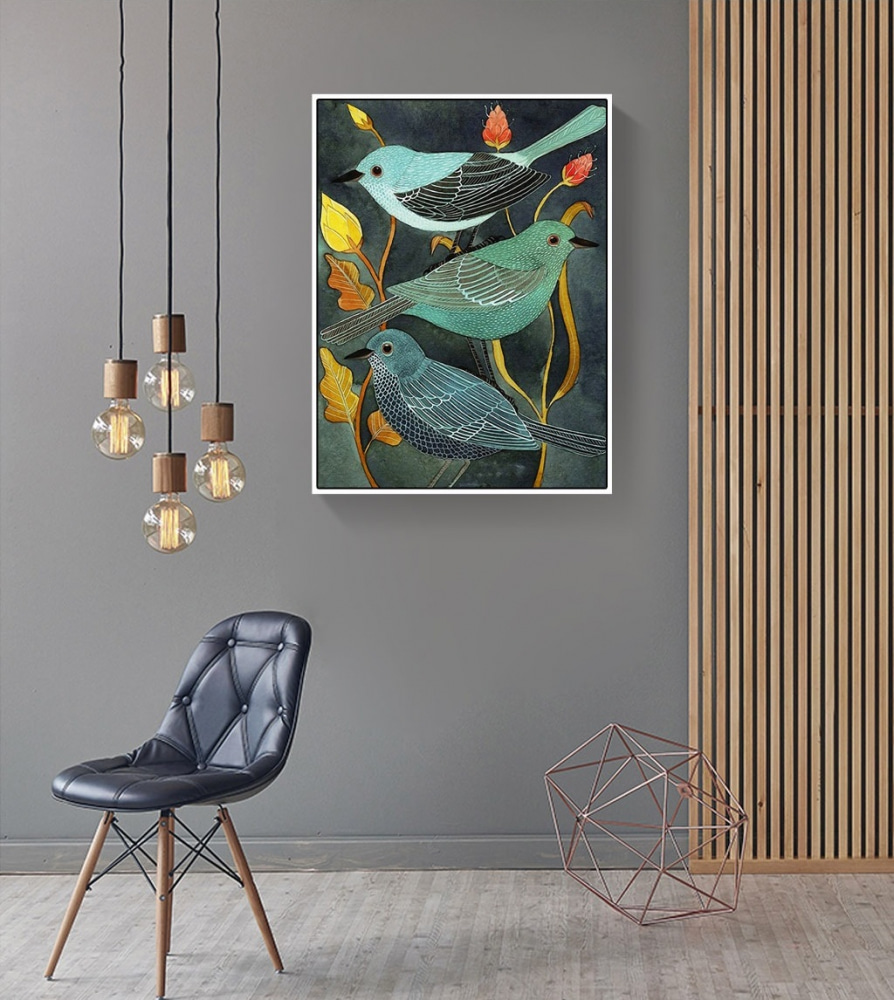Parfait pour cet endroit dont vous ne savez que faire – peut-être au-dessus de votre table basse où les invités se réunissent et discutent. Il est à la fois excentrique et élégant, et il raconte sa propre histoire. Ces oiseaux semblent avoir leur propre personnalité, comme s’ils étaient au courant d’un petit secret. N’entendez-vous pas le doux bruissement des feuilles, un doux rappel de la beauté qui se trouve juste derrière nos fenêtres ? Ajoute une ambiance douillette et sereine à votre maison.