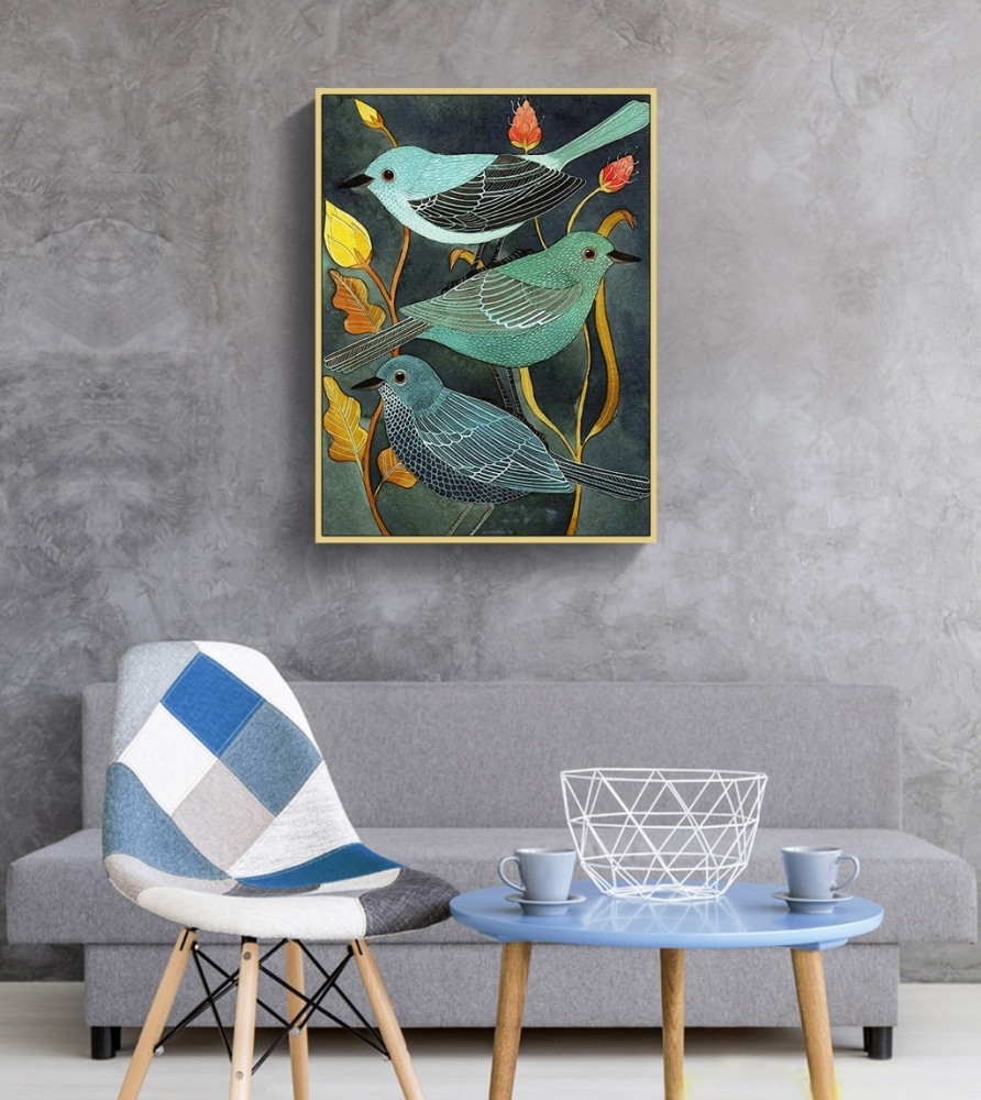 Imaginez que vous entrez dans votre salon et que la première chose que vous voyez est cette délicieuse explosion de couleurs et de charme. Le tableau “Trois oiseaux parmi des plantes colorées” est justement cette petite étincelle de joie dont votre espace pourrait avoir besoin ! Avec ces trois adorables oiseaux perchés au milieu d’un feuillage vibrant, presque fantaisiste, c’est comme si la nature avait décidé de venir prendre le thé. Le mélange de bleus, de verts et de touches d’orange donne l’impression d’une promenade dans un jardin ensoleillé.