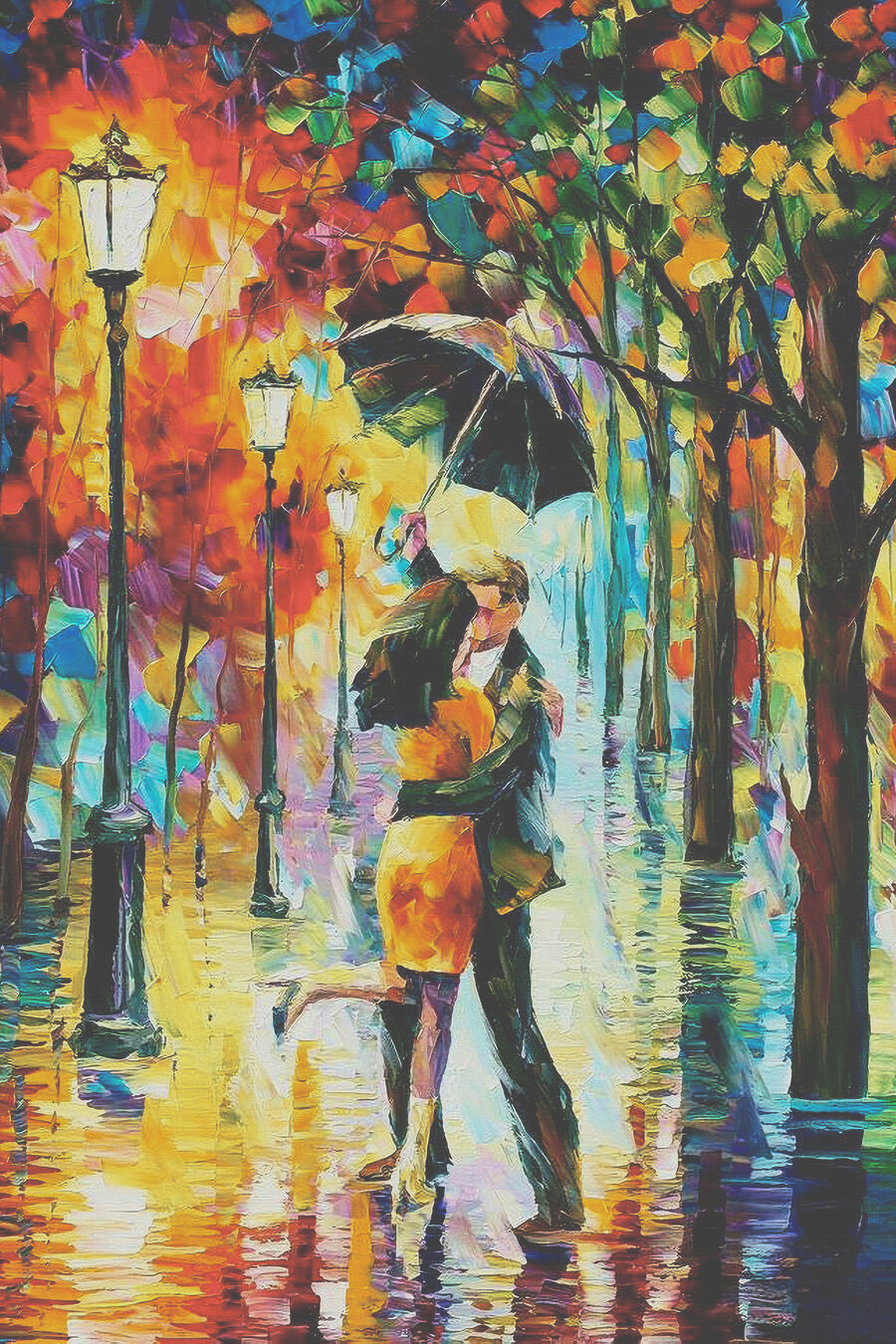 Imaginez : une soirée pluvieuse et sereine où un couple s’embrasse tendrement sous un parapluie. Affichez cela sur votre mur ! Cette vibrante impression sur toile capture ce moment magique avec une explosion de couleurs, comme un festival d’amour sous la pluie. Elle est parfaite pour tous ceux qui souhaitent ajouter une touche de romantisme à leur espace. C’est coloré, c’est audacieux et cela fera sourire tous les passants qui imagineront une douce histoire d’amour.