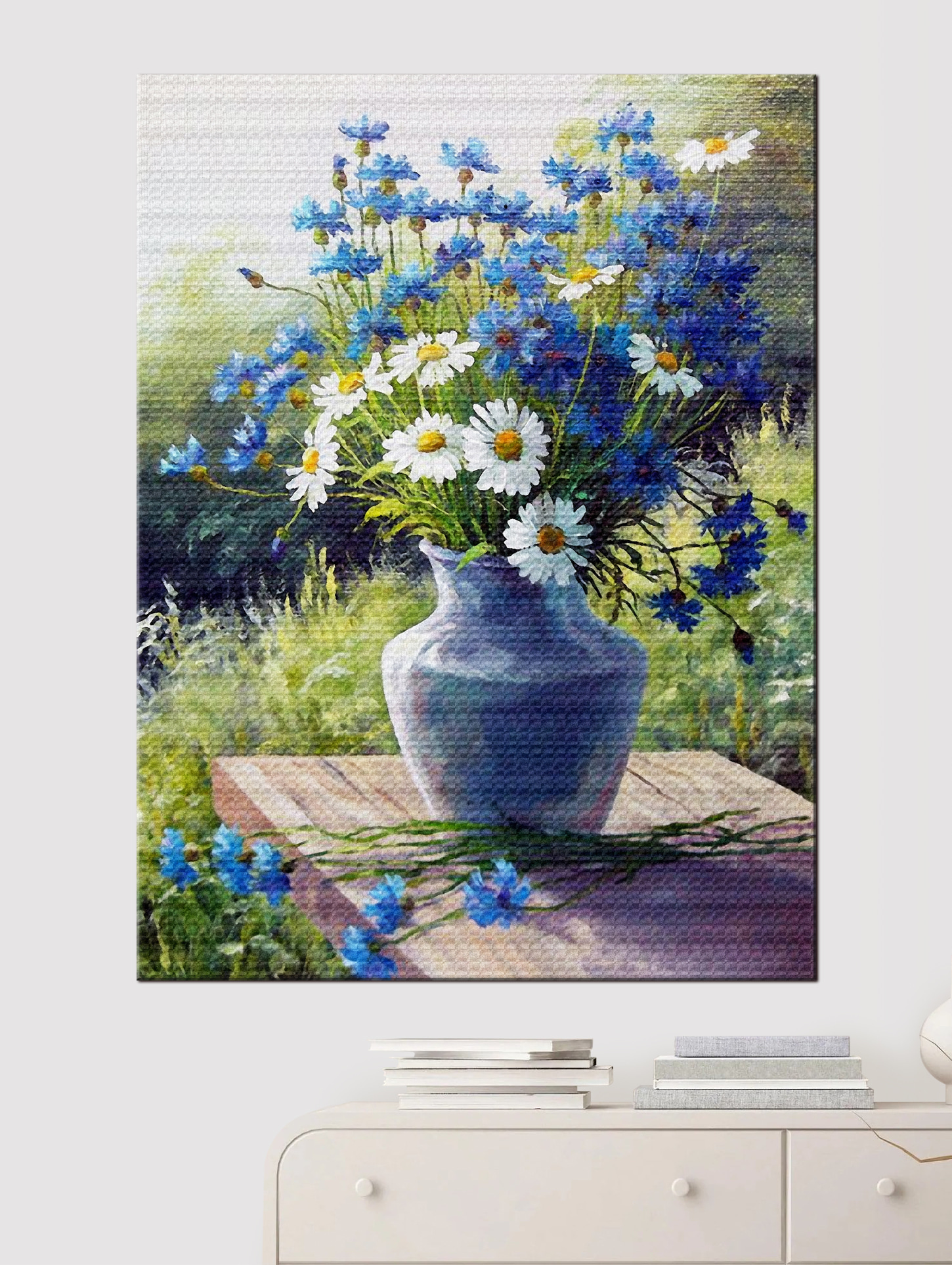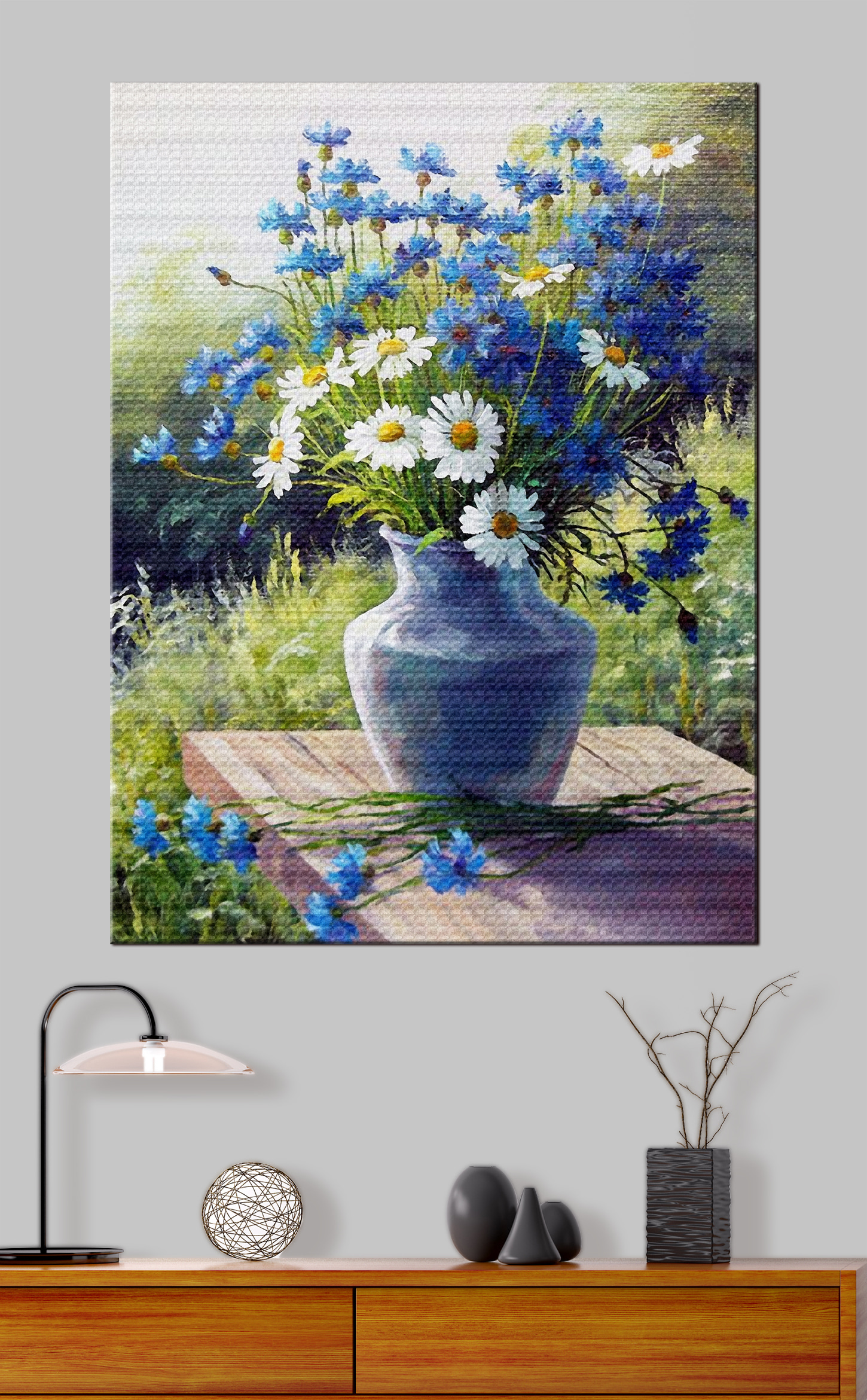 Imaginez ceci : une matinée paisible, la lumière du soleil traversant votre fenêtre, rebondissant sur une magnifique toile de bleuets et de marguerites joyeuses dans un vase. Oui, c’est aussi beau que cela. Cette impression sur toile n’est pas seulement une touche de couleur, elle raconte toute une histoire. Elle est parfaite pour votre salon, votre chambre à coucher ou ce mur solitaire que vous avez l’intention d’habiller. Elle apporte un peu de nature à l’intérieur – sans le pollen ! Les nuances de bleu et de blanc se détachent sur un fond vert tendre, ce qui donne l’impression que les fleurs pourraient se balancer sous l’effet d’une brise légère. À chaque coup d’œil, on sourit et on se sent un peu plus léger, comme si on avait fait une petite promenade dans une prairie d’été. Ribbit. Attendez, ce sont des grenouilles. Bzzz. Ça, c’est des abeilles. Quoi qu’il en soit, c’est comme le printemps sur la toile. Sympathique et accueillant, comme une discussion avec un vieil ami.