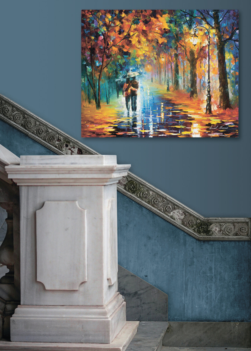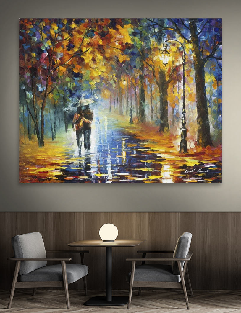 Jetez un coup d’œil à cette jolie toile d’art – une peinture représentant un couple marchant sous la pluie. Elle a un côté rêveur, presque magique, avec ses feuilles colorées et lumineuses éparpillées tout autour et son style tourbillonnant et impressionniste. Le parapluie ? C’est la touche parfaite, qui vous fait penser à vous blottir contre l’être aimé un jour de pluie. Imaginez ce tableau accroché dans votre salon – il vous met immédiatement de bonne humeur les jours sombres ! C’est un peu comme si vous entendiez la pluie tapoter et que vous ressentiez un sentiment de complicité à chaque fois que vous le regardez. Parfait pour ajouter une touche de couleur et de romantisme à n’importe quel espace.