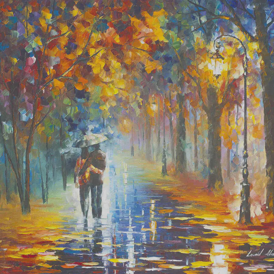 Jetez un coup d’œil à cette jolie toile d’art – une peinture représentant un couple marchant sous la pluie. Elle a un côté rêveur, presque magique, avec ses feuilles colorées et lumineuses éparpillées tout autour et son style tourbillonnant et impressionniste. Le parapluie ? C’est la touche parfaite, qui vous fait penser à vous blottir contre l’être aimé un jour de pluie. Imaginez ce tableau accroché dans votre salon – il vous met immédiatement de bonne humeur les jours sombres ! C’est un peu comme si vous entendiez la pluie tapoter et que vous ressentiez un sentiment de complicité à chaque fois que vous le regardez. Parfait pour ajouter une touche de couleur et de romantisme à n’importe quel espace.