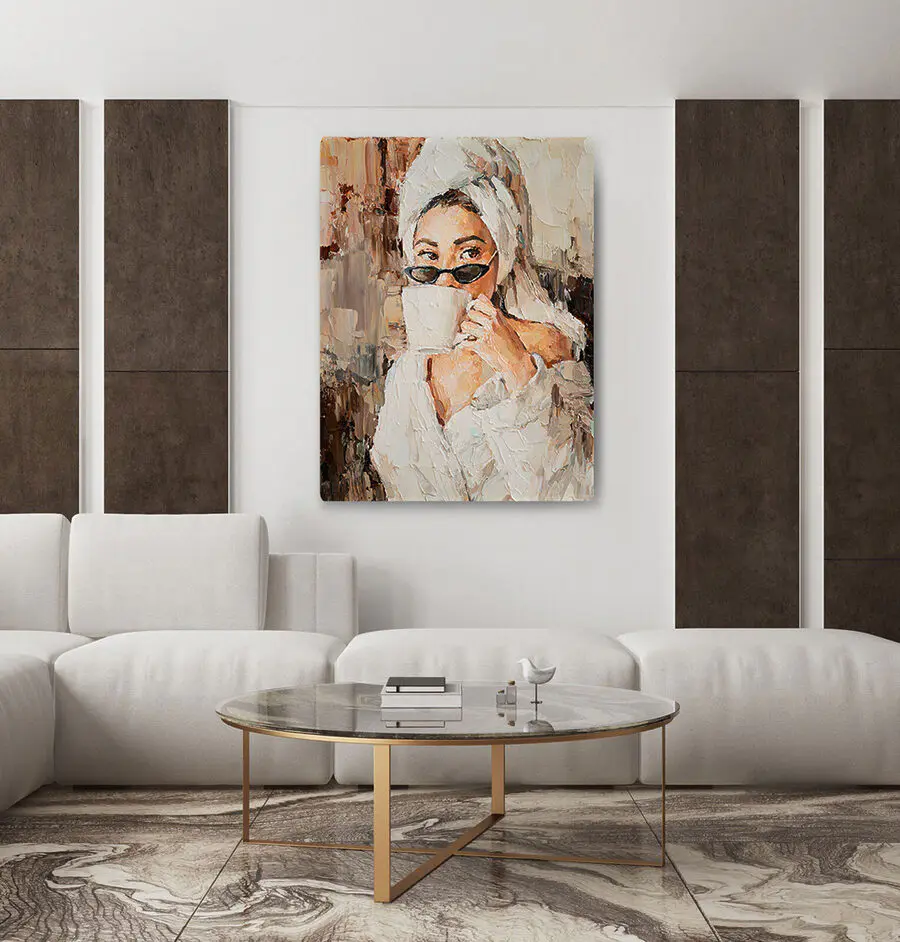 Imaginez ceci : un coin confortable dans votre maison, peut-être la cuisine ou ce coin près de la fenêtre. Imaginez maintenant que vous y accrochiez cette impression sur toile représentant une femme en train de savourer sa tasse de bonheur. Avec une serviette sur la tête et des lunettes qui crient “Je me suis réveillée comme ça”, elle a le chic sans effort. Les couleurs chaudes se marient bien, évoquant un sentiment de calme et vous invitant à prendre une pause. Parfaite pour un coin café ou un espace ayant besoin d’une touche d’élégance et d’amusement, cette pièce évoque ces moments de tranquillité que nous chérissons tous. Qu’il s’agisse de café ou de thé, cette œuvre d’art encourage à faire une petite pause, ce qui en fait un compagnon agréable dans la vie de tous les jours.