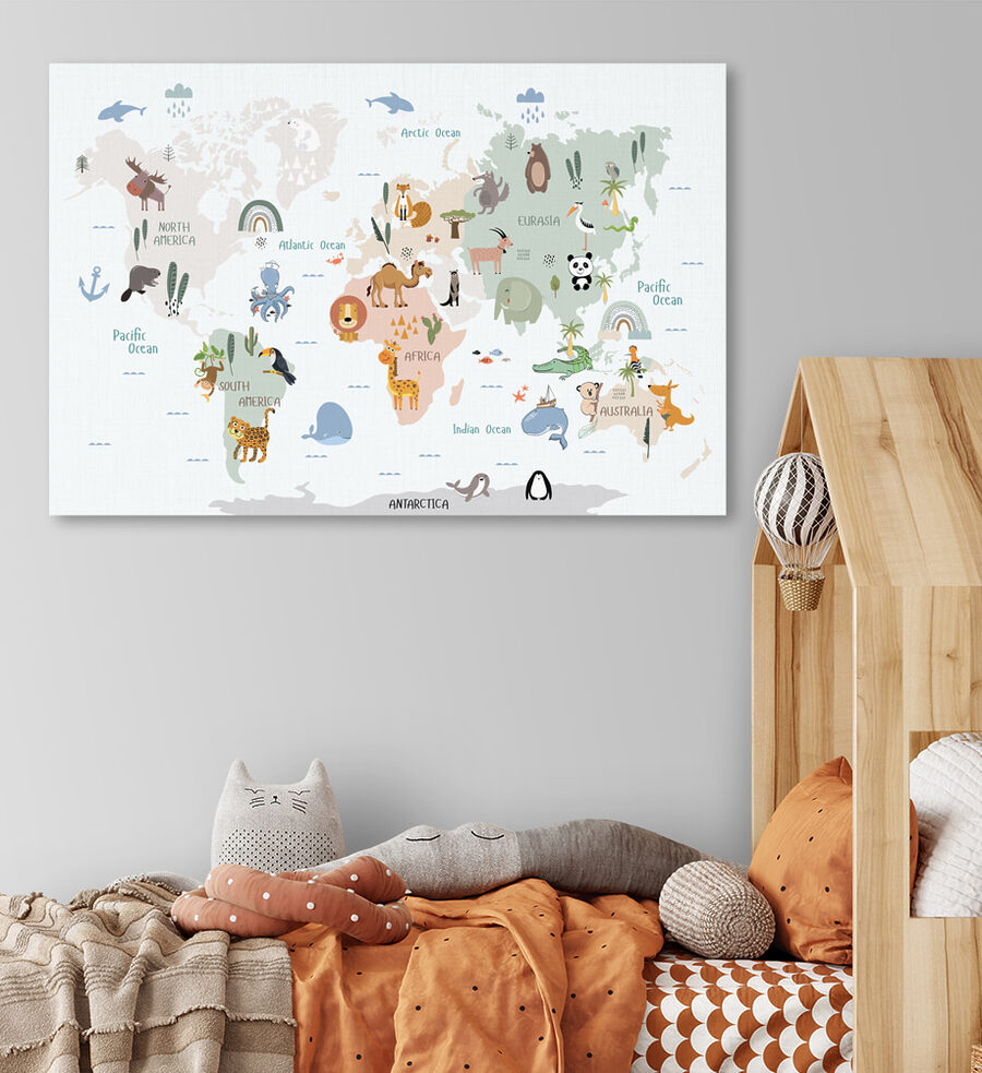 Cette impression sur toile ludique apporte une carte du monde fantaisiste dans la chambre de votre enfant. Il ne s’agit pas seulement de géographie, mais aussi d’aventure – avez-vous vu cet adorable chameau en Afrique ? Elle est parfaite pour éveiller l’imagination des enfants et leur faire découvrir le vaste monde qui les entoure. Chaque continent est peuplé de charmants animaux de dessins animés, des ours polaires de l’Arctique aux sympathiques kangourous de l’Australie. Imaginez les histoires que vos enfants inventeront en explorant ces scènes pleines de vie. Ce n’est pas seulement de l’art, c’est une aventure quotidienne, directement sur leur mur ! Une carte aussi mignonne pourrait bien vous faire regretter de ne pas être encore un enfant.