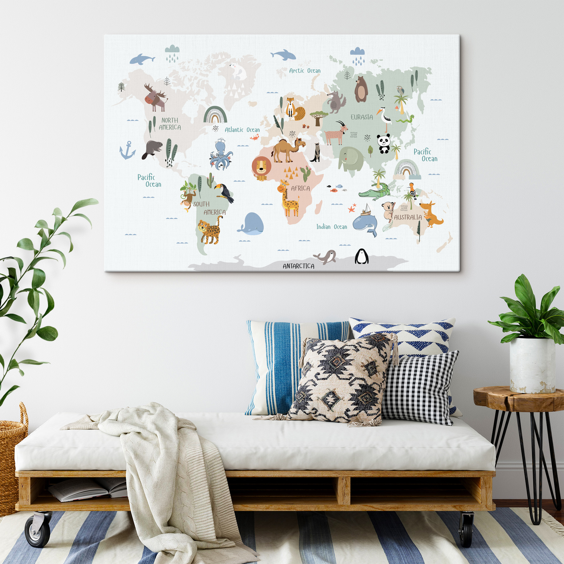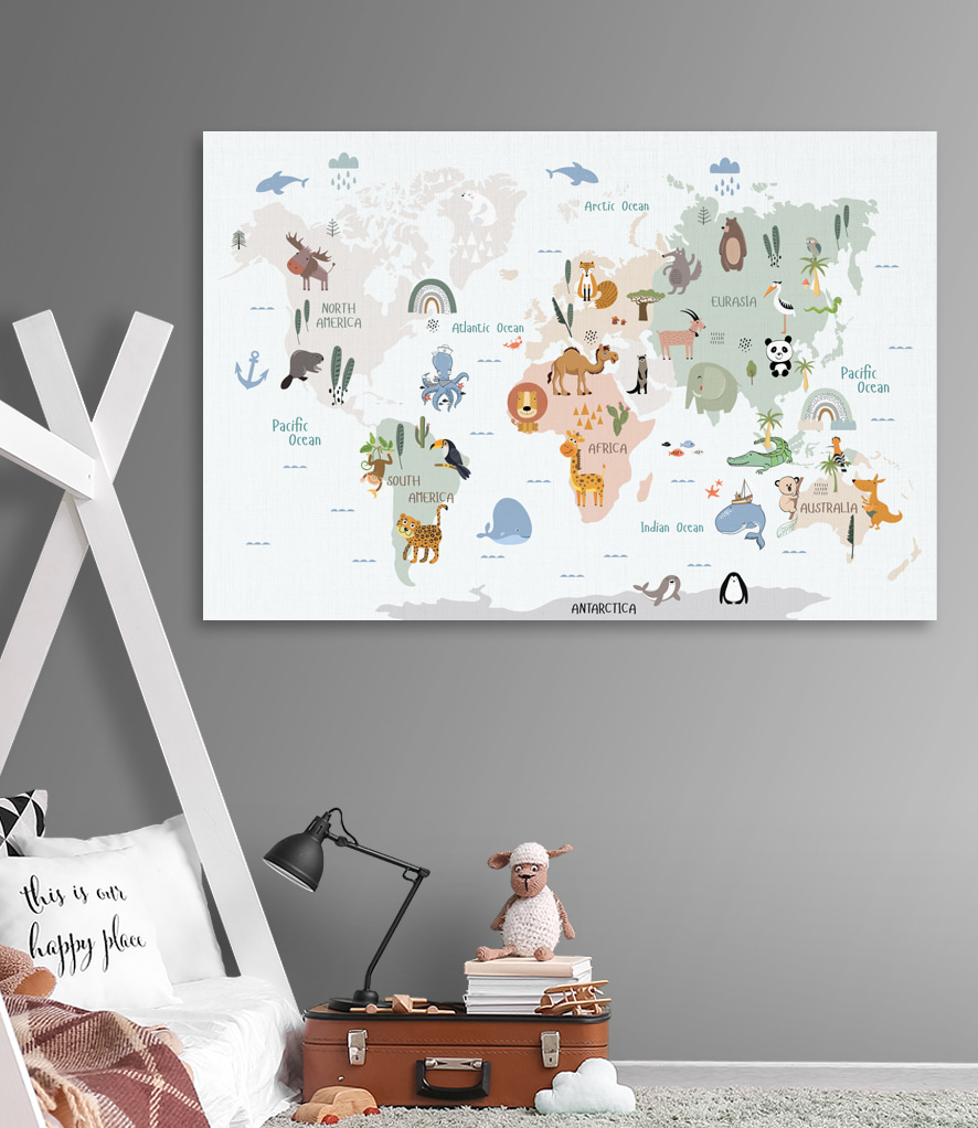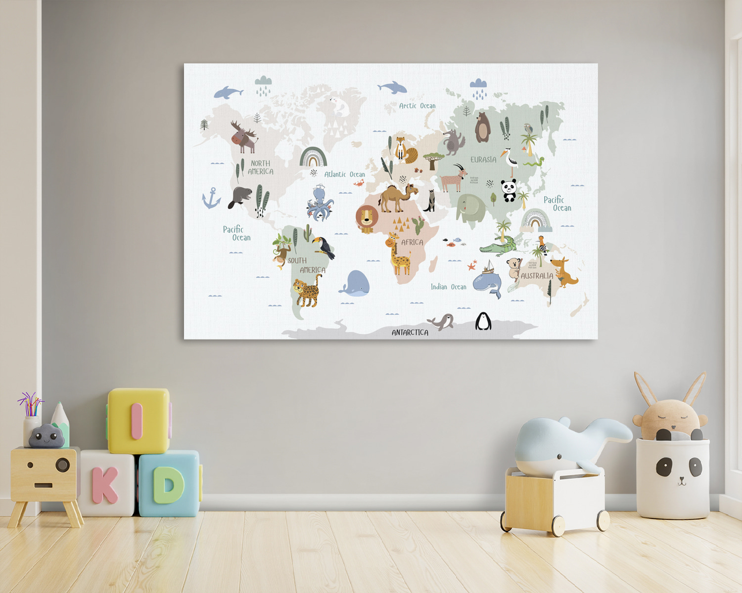 Cette impression sur toile ludique apporte une carte du monde fantaisiste dans la chambre de votre enfant. Il ne s’agit pas seulement de géographie, mais aussi d’aventure – avez-vous vu cet adorable chameau en Afrique ? Elle est parfaite pour éveiller l’imagination des enfants et leur faire découvrir le vaste monde qui les entoure. Chaque continent est peuplé de charmants animaux de dessins animés, des ours polaires de l’Arctique aux sympathiques kangourous de l’Australie. Imaginez les histoires que vos enfants inventeront en explorant ces scènes pleines de vie. Ce n’est pas seulement de l’art, c’est une aventure quotidienne, directement sur leur mur ! Une carte aussi mignonne pourrait bien vous faire regretter de ne pas être encore un enfant.