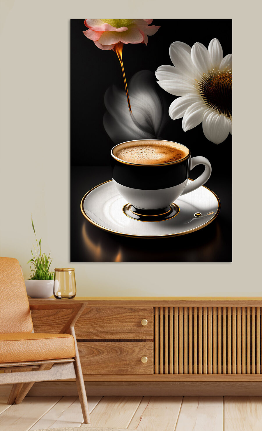 Imaginez que vous commenciez votre journée avec un expresso riche et aromatique, dont la chaleur emplit la pièce, tandis que de délicats tourbillons floraux dansent au-dessus. C’est l’ambiance qui se dégage de cette impression sur toile “Arôme floral tourbillonnant au-dessus de l’espresso”. Parfaite pour votre cuisine ou votre coin café ! Le design fantaisiste mélange des tons de café riches avec des fleurs douces, ajoutant un esprit douillet et invitant. Vous ne sentez pas l’odeur ? Pensez à la sérénité de votre matinée, en sirotant votre café, avec une toile débordant de charme et de souvenirs olfactifs accrochée à proximité.