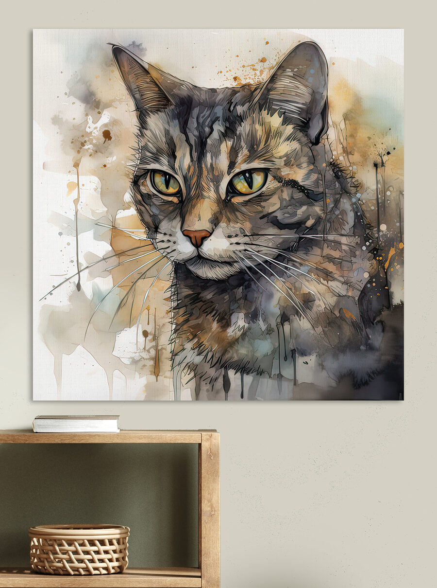 Vous avez toujours pensé que votre salon avait besoin d’un peu plus de personnalité ? Voici cette superbe impression sur toile – pensez-y comme un sujet de conversation qui ne mange pas tous vos snacks. L’œuvre “Tableaux s32299” capture le regard féroce mais quelque peu distant de ce chat dans des éclaboussures d’aquarelle vibrantes. Parfait pour les passionnés d’animaux comme pour les amateurs d’art, il dégage un charme et une touche de mystère – ces yeux, n’est-ce pas ?