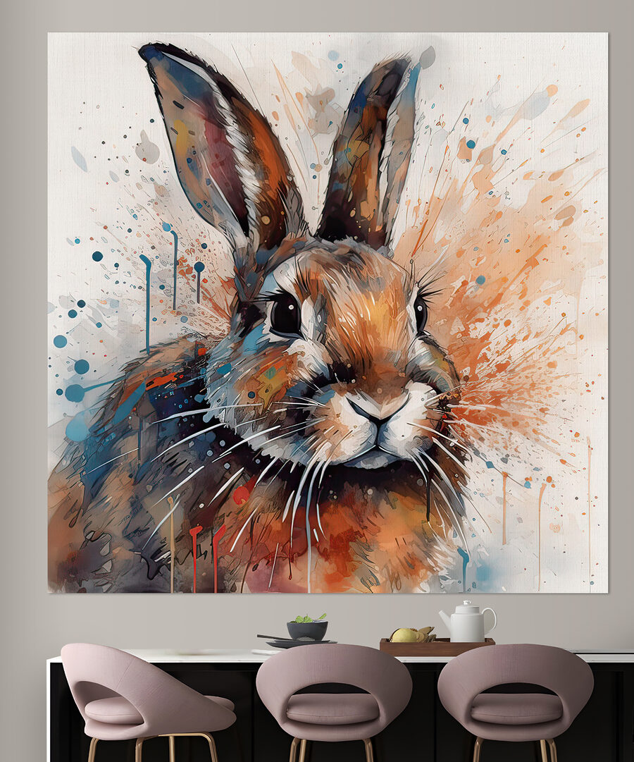 Imaginez : vous entrez dans votre espace après une longue journée, et ce lapin doux et presque espiègle vous attend pour vous accueillir. C’est comme un petit morceau d’art fantaisiste à la maison. Le mélange de tons chauds et froids le rend très polyvalent – il peut animer un salon minimaliste ou ajouter une touche d’humour à une chambre d’enfant. Et ces minuscules éclaboussures ? Elles ajoutent juste ce qu’il faut de flair artistique sans être trop évidentes.