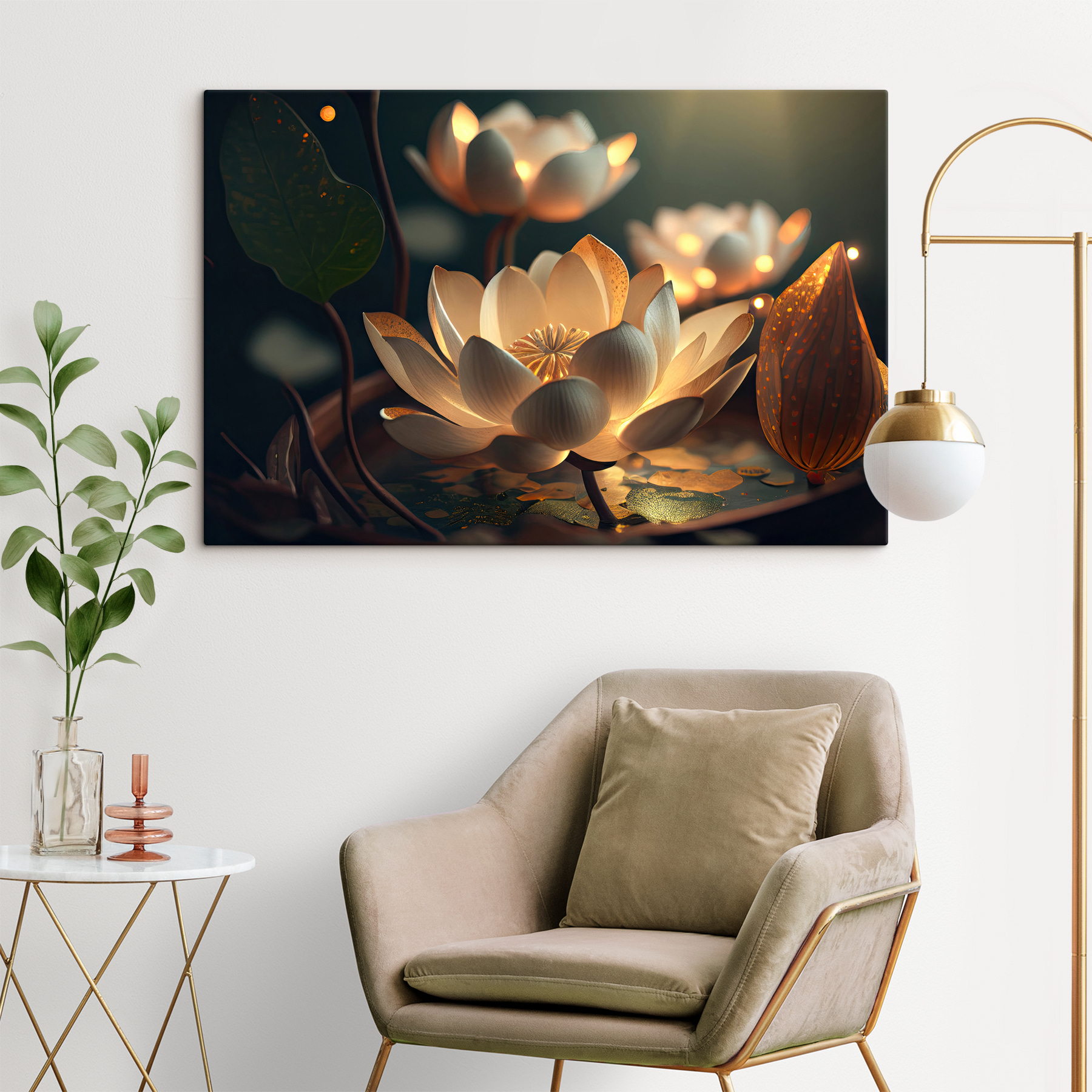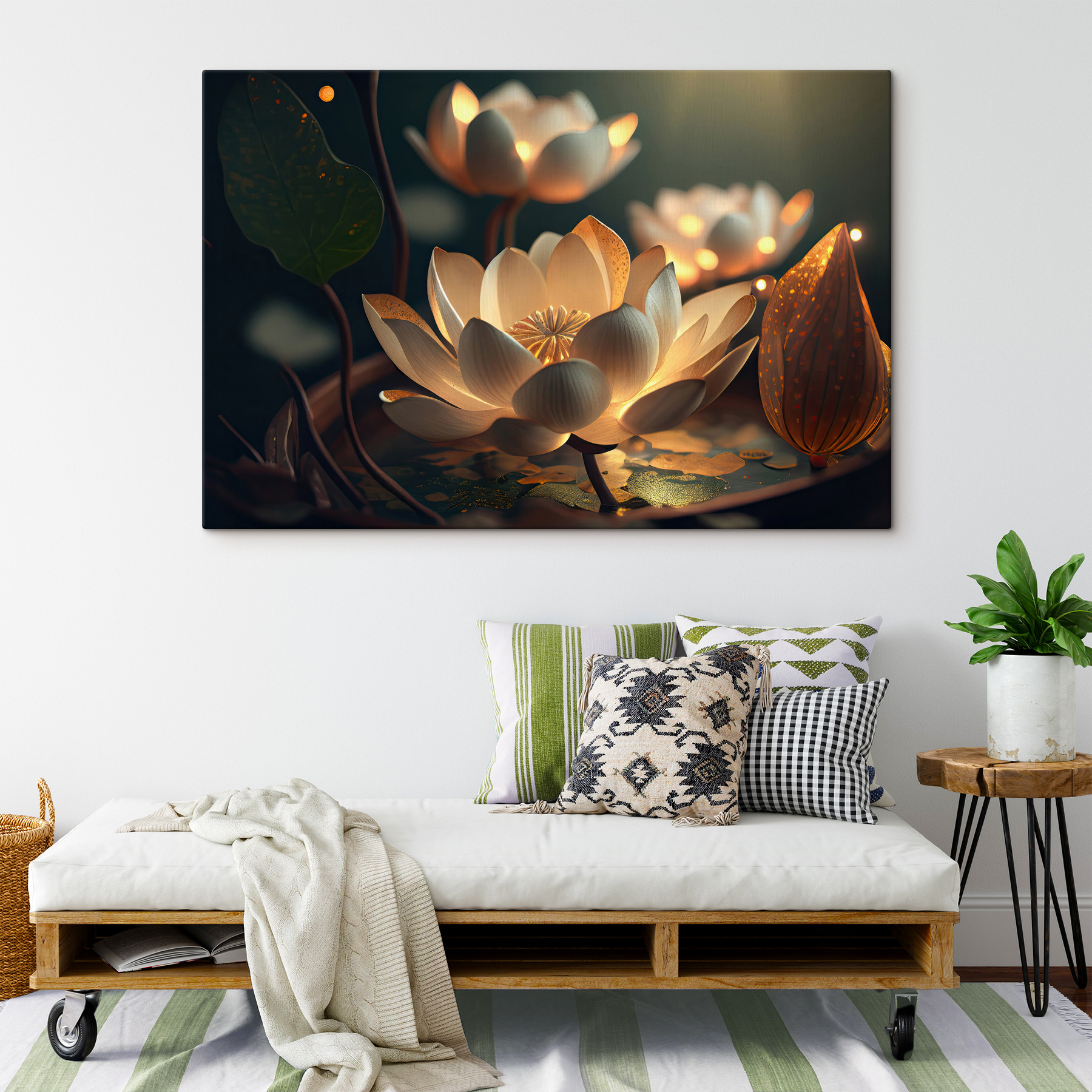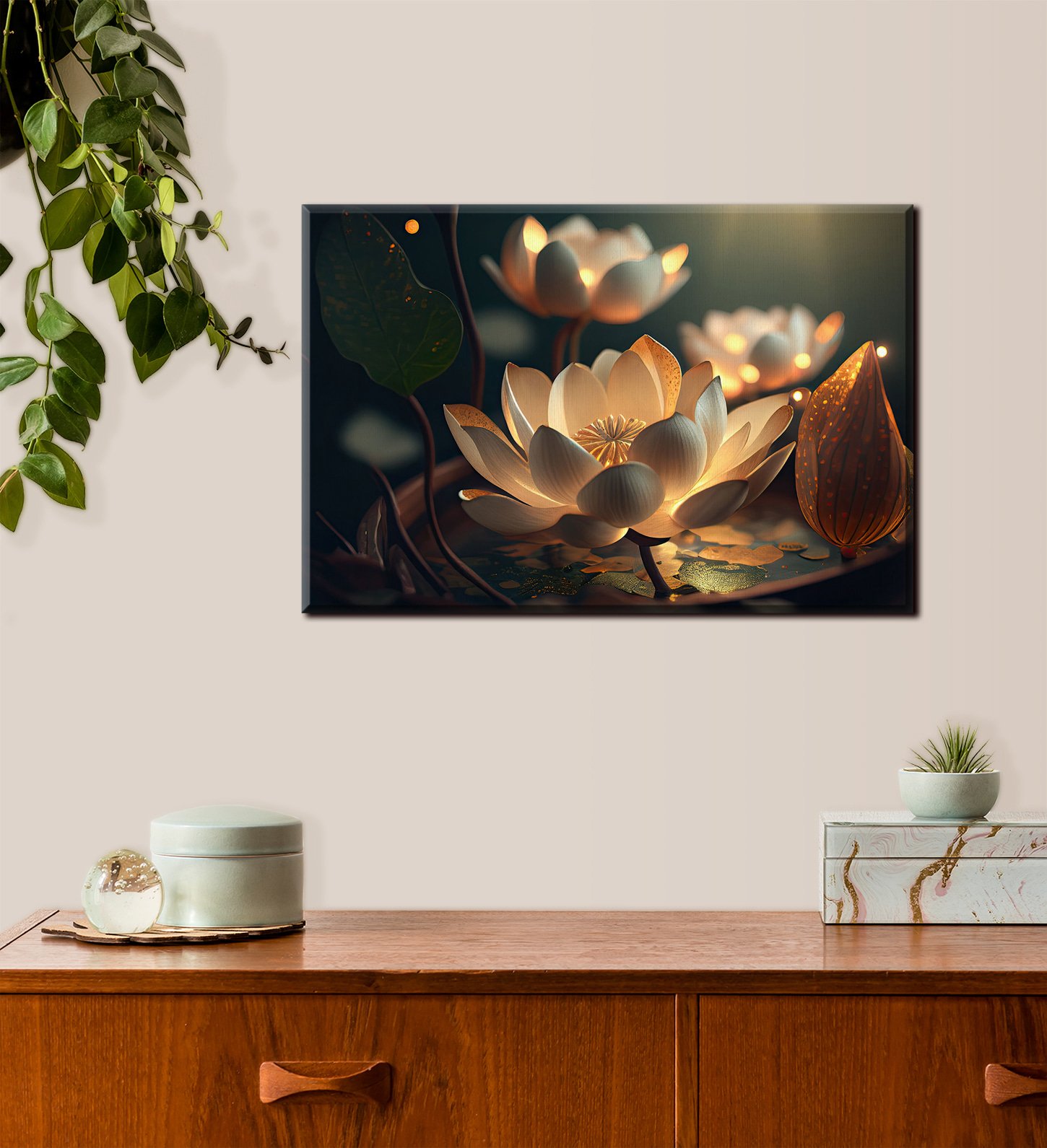 Transformez n’importe quel espace avec cette superbe impression sur toile représentant des fleurs de lotus illuminées. Imaginez ces pétales qui brillent doucement dans l’obscurité, créant une atmosphère sereine, parfaite pour se détendre après une longue journée ou pour créer l’ambiance d’une soirée confortable. Les couleurs délicates dansent les unes contre les autres, évoquant une ambiance enchanteresse qu’il est difficile de quitter des yeux. Qu’elle soit accrochée dans le salon ou dans un coin tranquille, cette œuvre d’art apporte une touche de calme et de joie. C’est comme si vous aviez un petit morceau de nature chez vous, vous rappelant de faire une pause, de respirer et d’apprécier la beauté qui vous entoure. Parfait pour ceux qui chérissent une décoration unique avec une histoire à raconter !