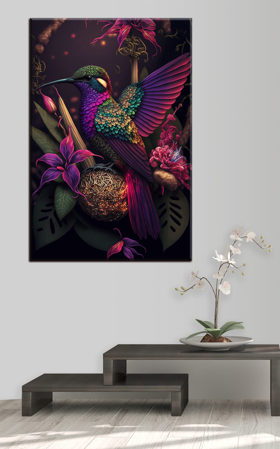 Alors, regardez ça : “Le colibri vibrant parmi les fleurs exotiques”, c’est comme si vous preniez le défilé le plus coloré de la nature et que vous l’éclaboussiez sur votre mur. Ce n’est pas seulement une œuvre d’art, c’est une explosion de couleurs vives qui attirera l’attention de tous les visiteurs dès qu’ils entreront dans la pièce. Imaginez cet oiseau joyeux dans votre salon, apportant une touche de gaieté lors d’une journée morose. Ce sont ces teintes riches et profondes, ainsi que les détails minuscules et complexes des fleurs, qui vous donnent l’impression d’être au cœur d’un paradis tropical.