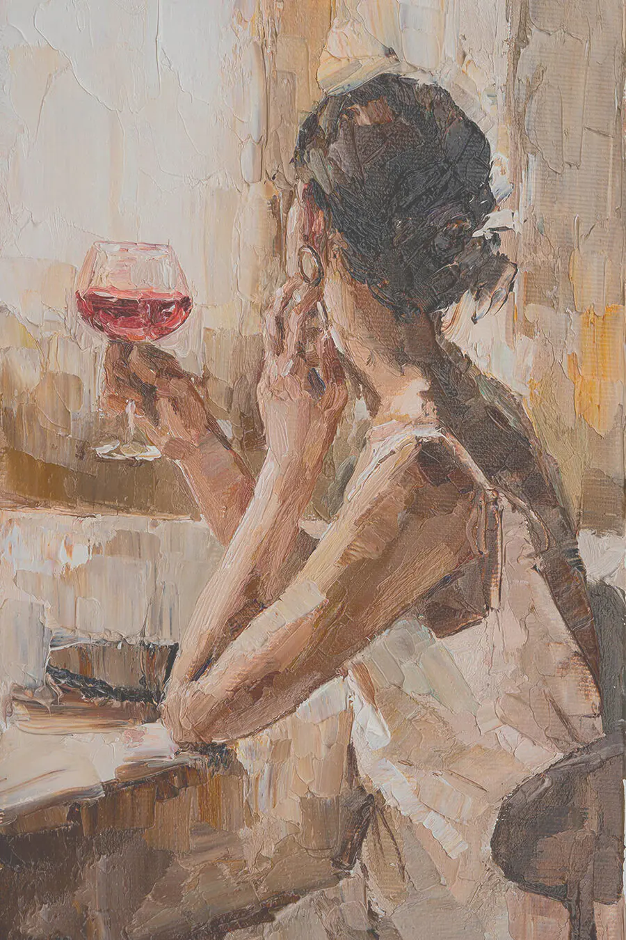Entrez dans un moment de calme avec cette toile captivante représentant une femme savourant son vin. La façon dont la lumière danse sur son verre a quelque chose de magique, invitant à la rêverie et aux conversations chaleureuses. Cette œuvre évoque les soirées douillettes, les rires entre amis et la joie simple d’un bon vieux toast. Parfaite pour un salon ou un coin tranquille, elle ajoute une touche de chaleur et d’élégance à n’importe quel espace. Imaginez-vous en train de vous lover avec un livre à proximité, un verre à la main, et de vous imprégner des vibrations sereines – vous le sentez ? Cette œuvre d’art est une invitation à la conversation, un doux rappel à savourer les petits plaisirs de la vie.