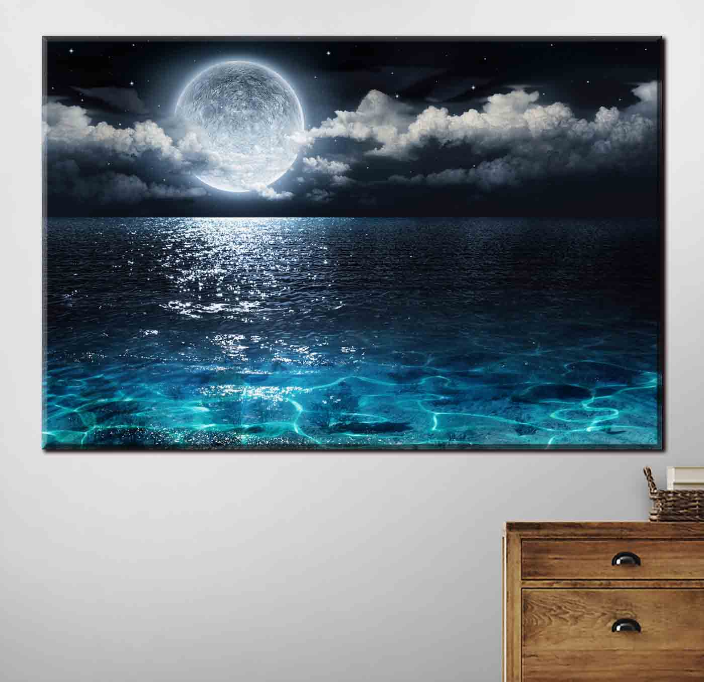 Imaginez que vous accrochiez cette beauté à votre mur – la “toile imprimée Lune et nuages dans le ciel”. Vous auriez vraiment l’impression que chaque nuit est une escapade tranquille. Il suffit de regarder cette lune scintillante, dont la lumière danse sur les vagues. C’est comme si vous aviez un morceau de plage dans votre chambre. La façon dont les nuages flottent paresseusement – vous pouvez presque entendre la douce brise nocturne. Parfait pour ceux qui rêvent de la mer ou qui ont besoin d’un peu de sérénité après une journée bien remplie. Cette photo est aussi un excellent sujet de conversation – vos amis vous demanderont peut-être si vous l’avez prise pendant des vacances exotiques !