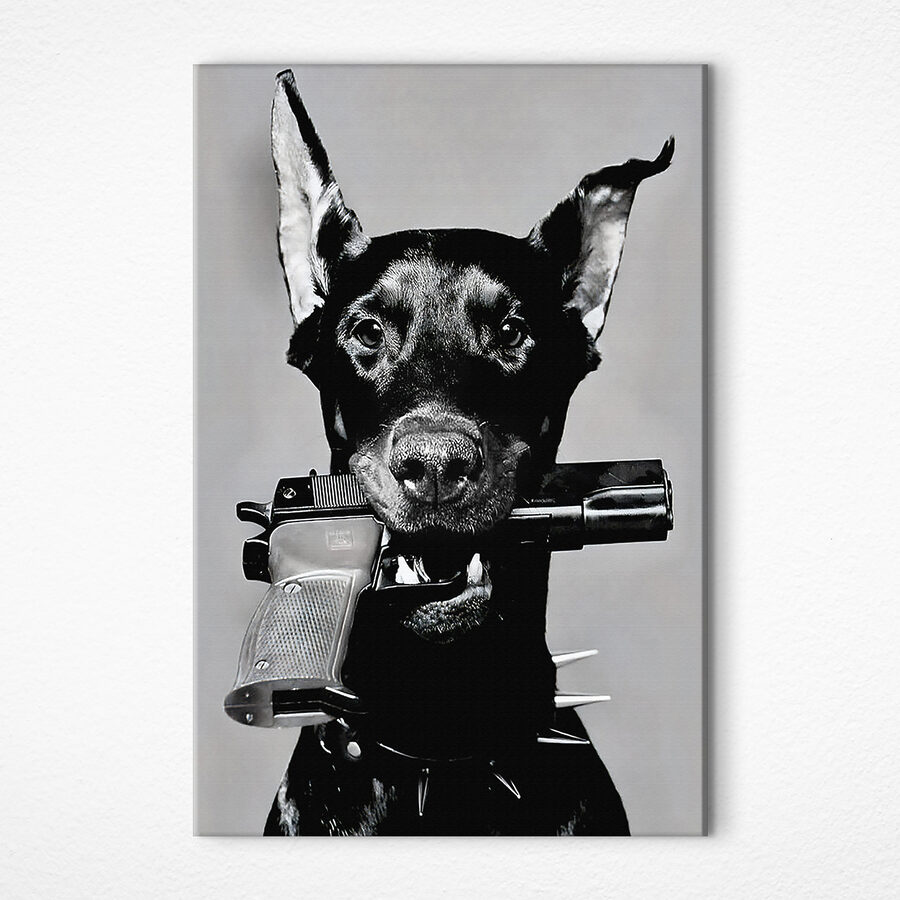 Imaginez une décoration d’intérieur ludique : cette impression sur toile unique représente un chien tenant un fusil, et oui, elle est aussi accrocheuse qu’elle en a l’air. C’est comme si ce chiot disait : “Je suis un dur à cuire, mais je veux quand même qu’on me caresse le ventre”. Parfaite pour les amoureux des animaux qui apprécient un peu d’audace, elle ne manquera pas de susciter des conversations.