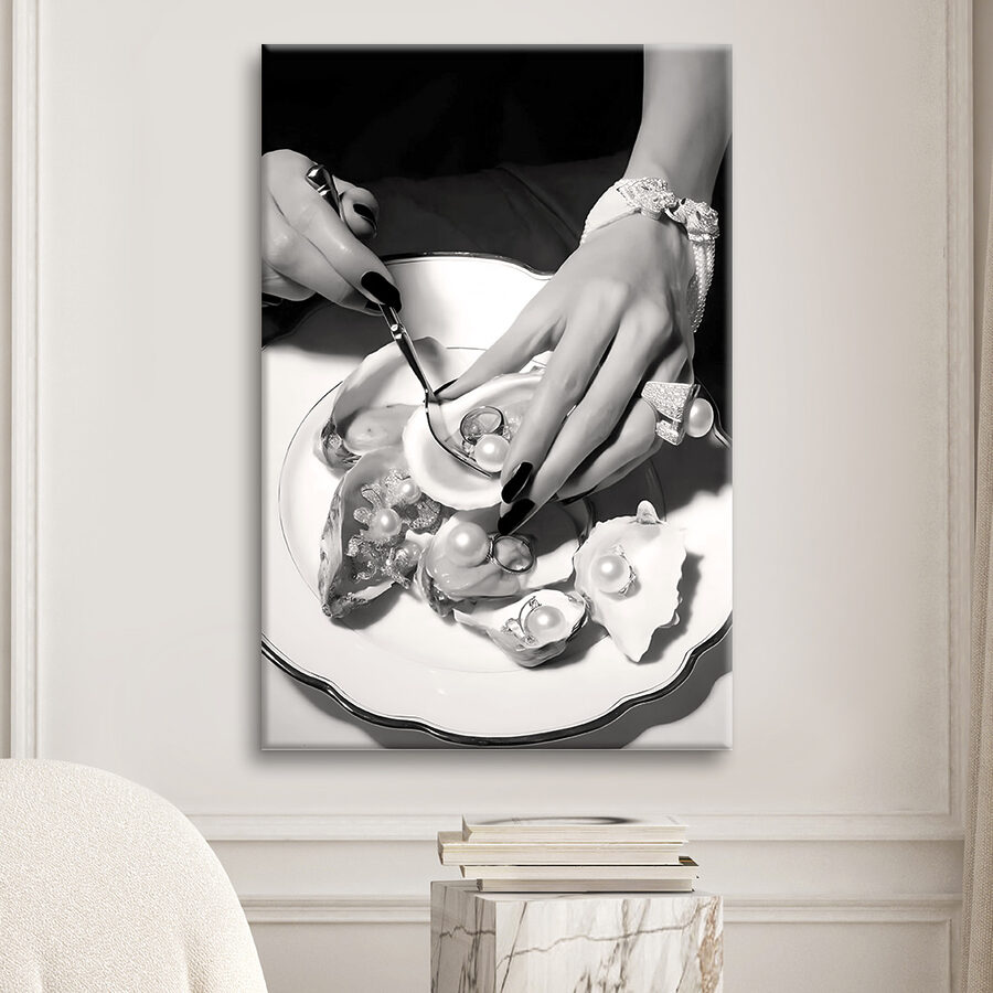 Imaginez : un élégant chef-d’œuvre en noir et blanc représentant une femme tenant une cuillère et une huître – cela semble intrigant, n’est-ce pas ? Ce tableau possède un charme minimaliste et intemporel qui rehausse instantanément n’importe quel espace. Parfait pour la cuisine ou la salle à manger, il évoque l’élégance et le mystère.