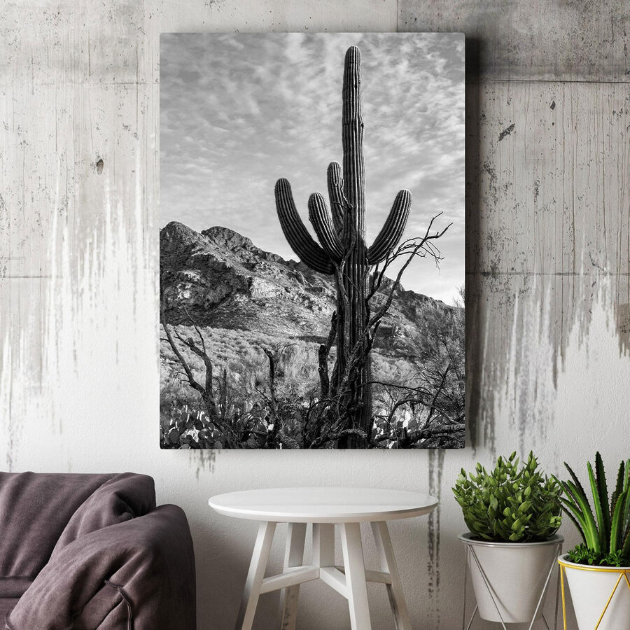 Imaginez que vous fassiez entrer une tranche de désert dans votre salon grâce à cette superbe toile imprimée “Cactus dans le désert”. Elle est en noir et blanc, ce qui lui permet de s’harmoniser avec presque tout. Mais ce n’est pas n’importe quel cactus : il a du caractère. C’est un peu comme s’il levait les bras en disant “Regardez-moi !”. Parfait pour les dimanches matins paresseux où l’on a envie de siroter un café et de rêvasser. Cette pièce pourrait vous inciter à parler d’aventure, ou peut-être simplement à boire plus de café. Quoi qu’il en soit, elle ne manquera pas d’alimenter les conversations !