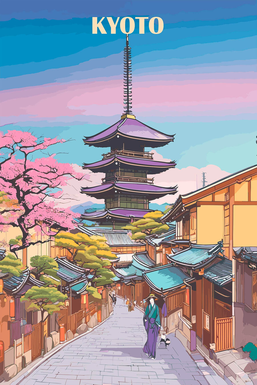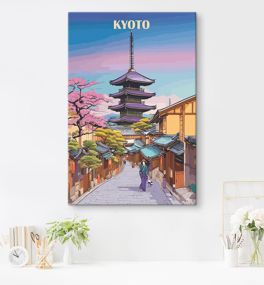 Imaginez que vous vous promenez dans une charmante rue de Kyoto, les cerisiers en fleurs se balançant doucement, la pagode emblématique se dressant fièrement dans un ciel pastel. Cette impression sur toile ne se limite pas à l’architecture : elle chante la beauté d’une aventure tranquille. Parfait pour votre espace si vous avez envie d’une touche d’exotisme sans quitter votre canapé. C’est comme si vous aviez une fenêtre sur un monde serein et poétique. Peut-être que cela vous inspirera des moments zen dans votre journée. Accrochez-le et laissez votre chambre s’imprégner de cette magie paisible et intemporelle.