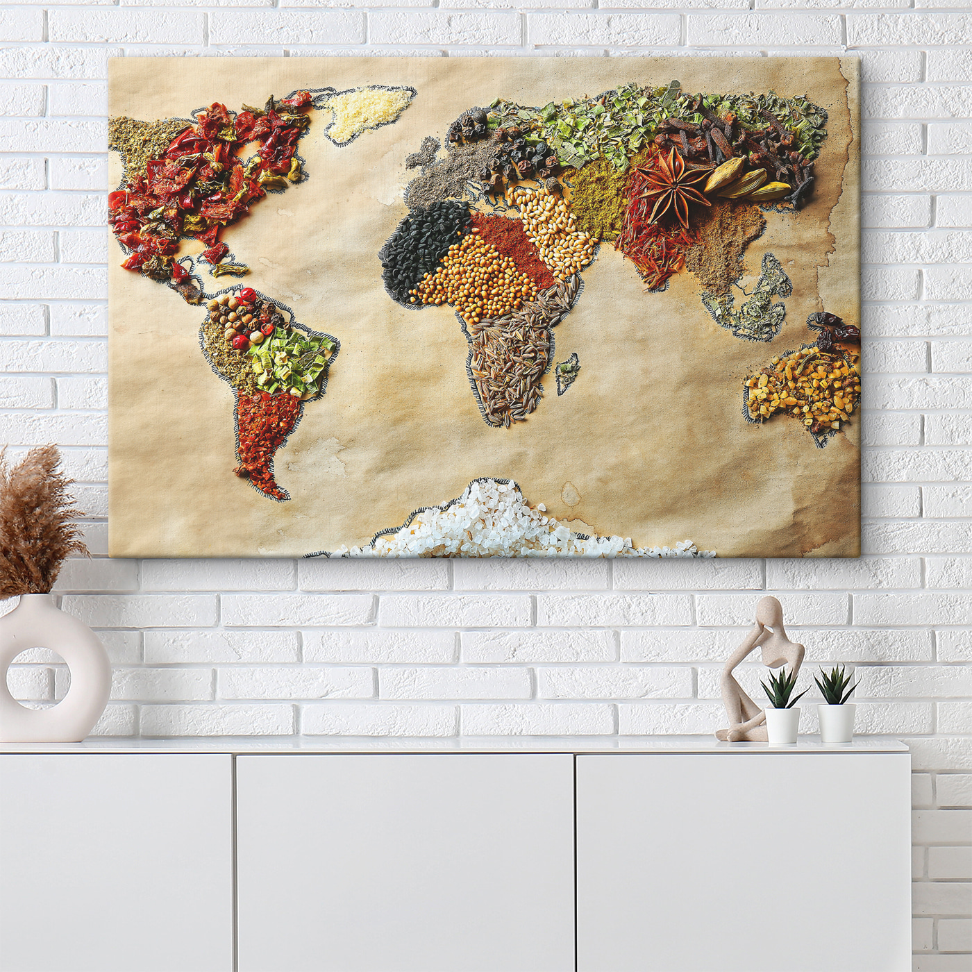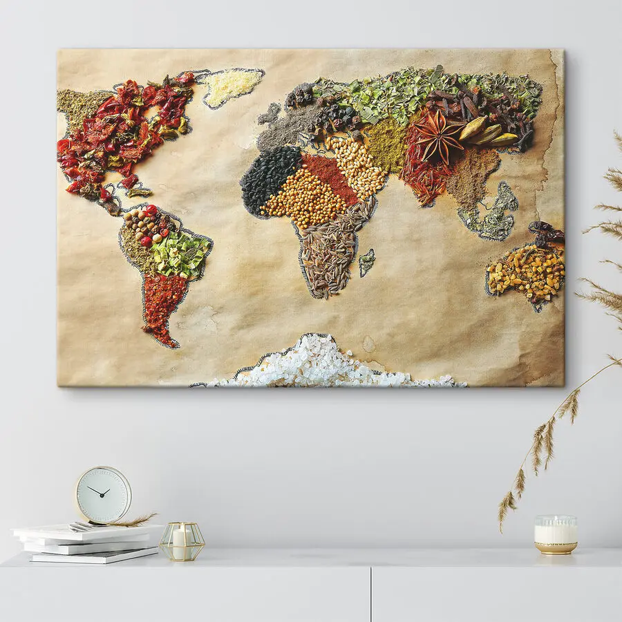 Hé, les amateurs de déco ! Jetez un coup d’œil à cette impressionnante toile imprimée, “Carte du monde faite d’épices”. De quoi alimenter les conversations ! Imaginez-la accrochée dans votre cuisine ou votre salle à manger – c’est comme une aventure culinaire mondiale à chaque fois que vous la regardez. Chaque continent est composé d’épices, de textures et de couleurs différentes. On se demande comment chaque épice sent et goûte, n’est-ce pas ?