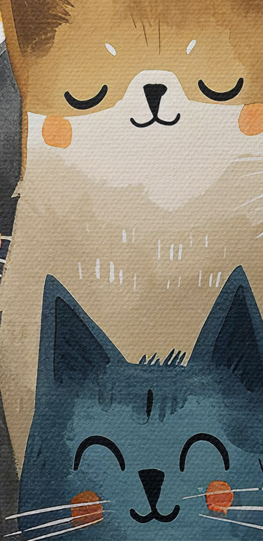 C’est idéal pour créer une ambiance ludique, comme si un livre d’histoires prenait vie. Accrochez-le dans la chambre des enfants et observez comment il devient rapidement leur favori ! Pensez à des histoires de chats fantastiques à l’heure du coucher. Vous pouvez aussi l’accrocher dans votre espace de vie, ce qui alimentera instantanément les conversations. “Oh, ce chat bleu ? Il s’appelle Whisker McGee !” Les couleurs sont vives mais douces, ce qui donne une impression de confort et de douceur, que vous ayez cinq ou cinquante-cinq ans.