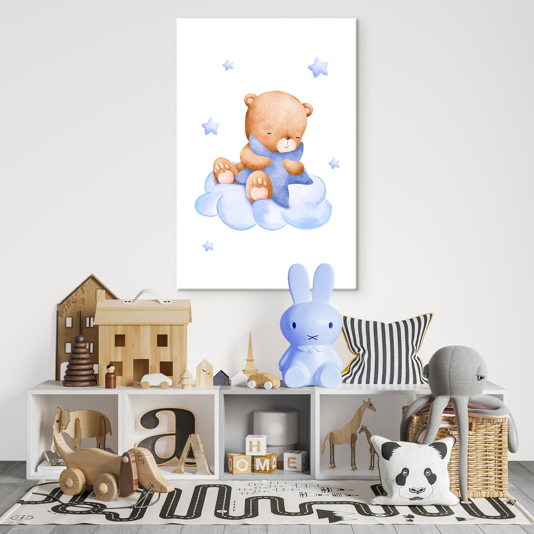 N’est-ce pas la plus belle des petites choses ? Imaginez cette charmante toile accrochée dans la chambre d’un enfant, suscitant toutes sortes de rêves fantaisistes. Imaginez un ours en peluche qui roupille doucement sur un nuage doux et moelleux, enveloppé dans un câlin douillet avec une étoile bleue scintillante.