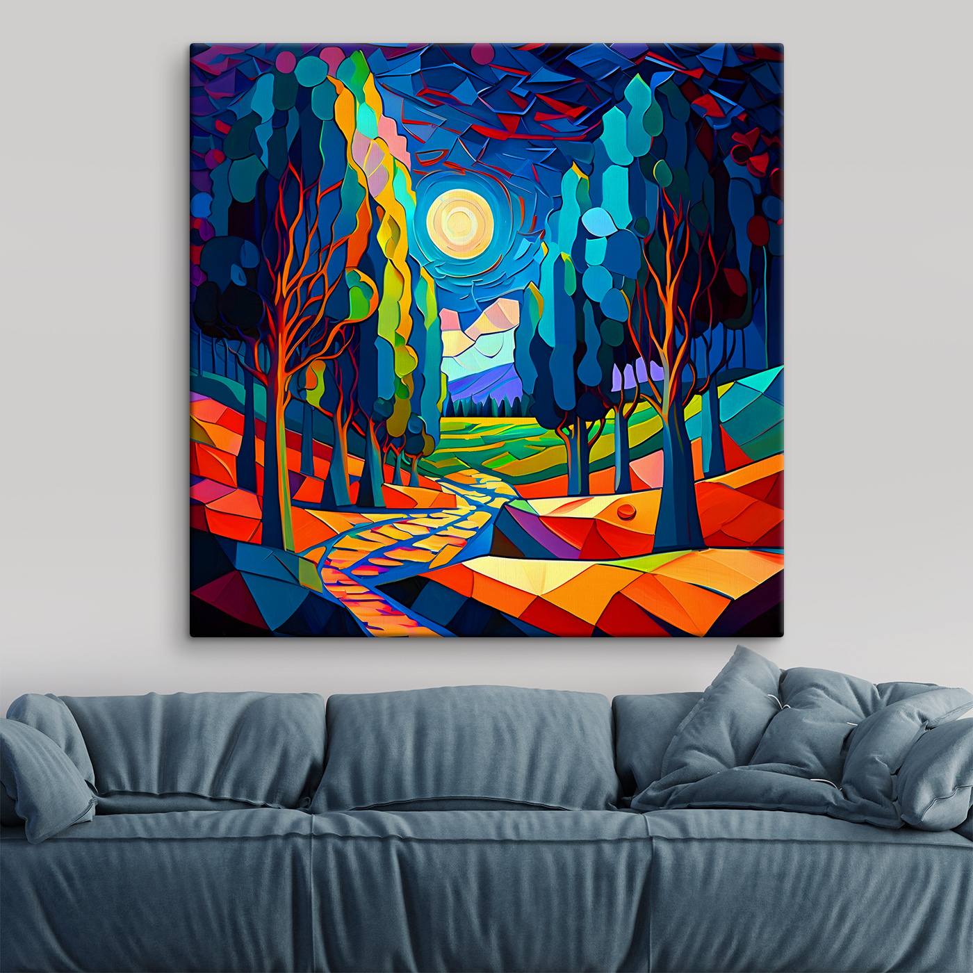 Imaginez que vous rentriez chez vous et que ce “Paysage coloré avec des arbres et un chemin” s’affiche sur votre mur – c’est comme si vous entriez directement dans un rêve joyeux. Les couleurs vives et le design fantaisiste ne peuvent que vous faire sourire. Des bleus audacieux et des verts étincelants, avec des touches d’oranges flamboyantes, dessinent un sentier forestier enchanteur. C’est comme si les arbres avaient des secrets et que ce chemin ? C’est votre voyage. Parfait pour une pièce qui a besoin d’une touche de vie ou d’un coup de pouce pour partir à l’aventure. Conseil d’expert : il se marie à merveille avec un coin lecture confortable ou une salle familiale animée. Il y a quelque chose de magique – il murmure presque : “Venez, perdez-vous en moi”.