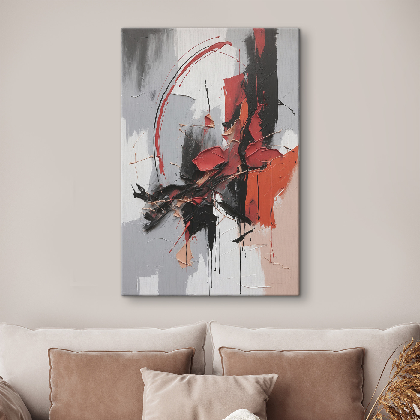 Voici une impression sur toile qui est plus qu’une simple décoration – c’est une véritable explosion d’énergie sur votre mur. Intitulée “Expression abstraite avec des coups de pinceau audacieux”, elle représente exactement cela : une émotion artistique pure et non filtrée. Les couleurs – des rouges riches, des noirs audacieux, des gris doux – s’assemblent comme une symphonie inattendue. Il se peut que vos yeux y reviennent, découvrant de nouveaux détails à chaque coup d’œil.