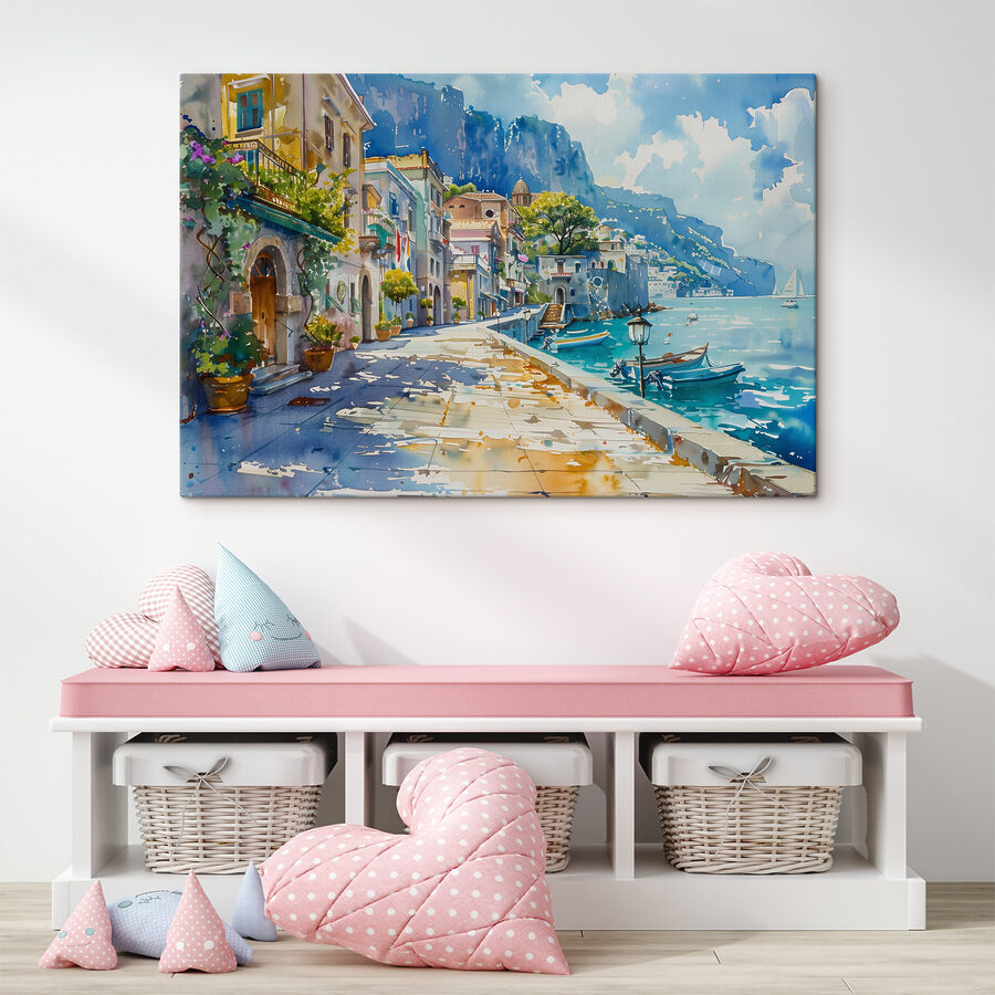 Illuminez n’importe quel mur avec cette charmante impression sur toile d’un village de bord de mer, où des bateaux colorés flottent doucement sur l’eau éclairée par le soleil. Imaginez que vous pénétrez dans cette scène sereine, que vous sentez la douce brise sur votre visage et que vous entendez les rires lointains des gens qui profitent de la journée. Parfaite pour un salon confortable ou une entrée joyeuse, elle murmure des histoires de promenades en bord de mer et d’après-midi ensoleillés. Les aquarelles ludiques apportent une touche de fantaisie et transforment n’importe quel espace en une charmante escapade. Il suffit d’un coup d’œil pour être transporté – qui a besoin de vacances quand son mur peut être une fenêtre sur le paradis ?