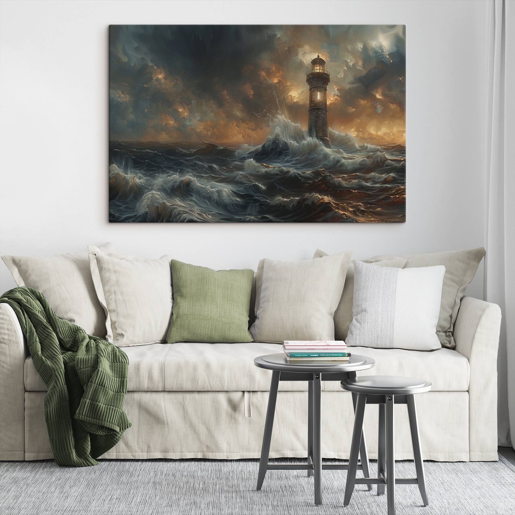 Besoin d’une touche de drame dans votre chambre ? Cette impression sur toile, intitulée “Lighthouse towers over stormy waves”, pourrait bien être ce qu’il vous faut ! Imaginez un phare se dressant contre des vagues furieuses et des nuages menaçants. Ce n’est pas seulement une œuvre d’art, c’est une histoire de résilience et d’espoir. Parfait pour les moments où vous avez besoin d’un coup de pouce. Placez-la dans votre salon, et chaque coup d’œil vous donnera l’impression de respirer l’air frais et profond de l’océan. De plus, c’est un excellent moyen d’engager la conversation. Croyez-nous, vous vous surprendrez à rêvasser sur les mers déchaînées et les âmes courageuses qui les affrontent.