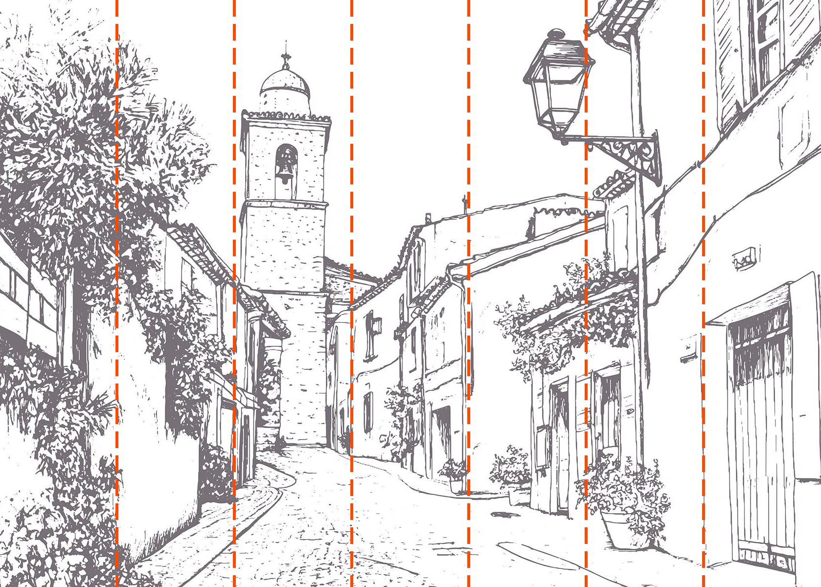 Papier peint Dessin d'une rue avec des bâtiments et un clocher