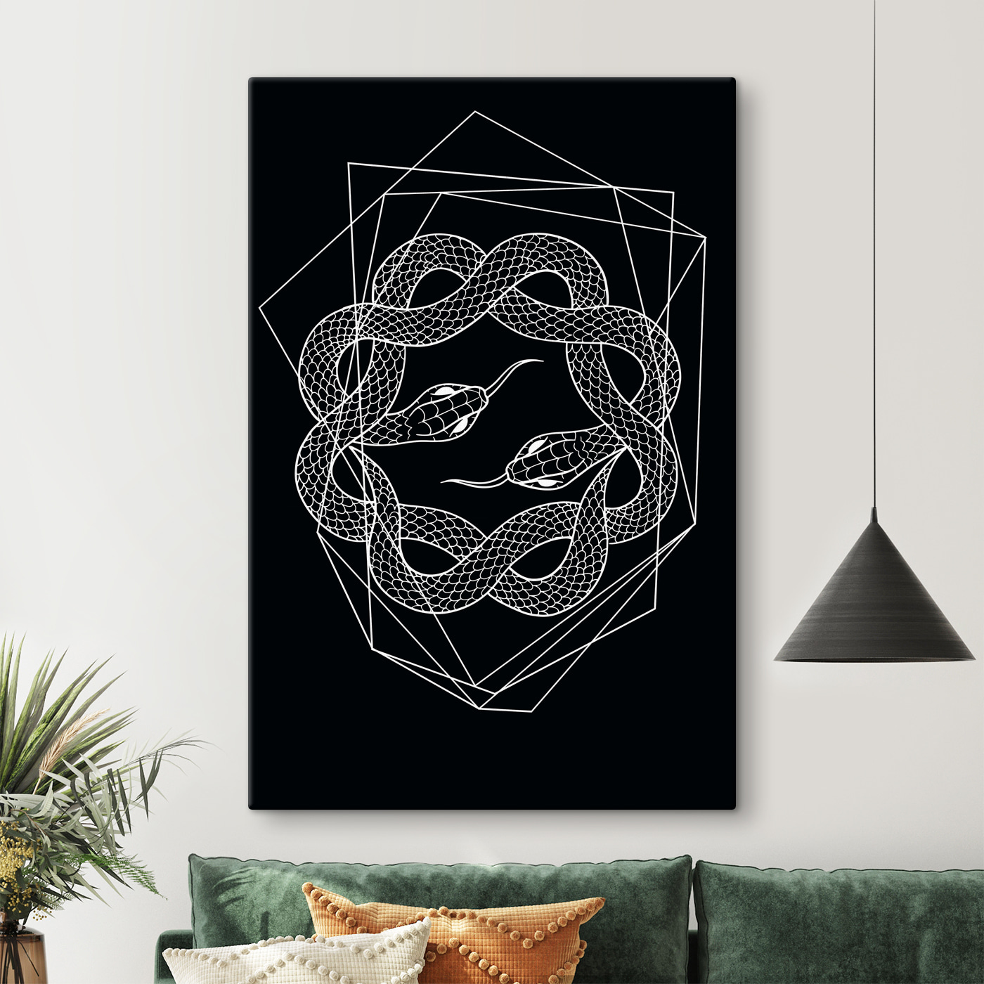 Et voici une superbe toile imprimée en noir et blanc qui représente un dessin de serpent complexe ! On se croirait tout droit sorti d’un rêve. Imaginez-la accrochée dans votre salon ou votre bureau ; elle représente l’équilibre parfait entre modernité et mysticisme.