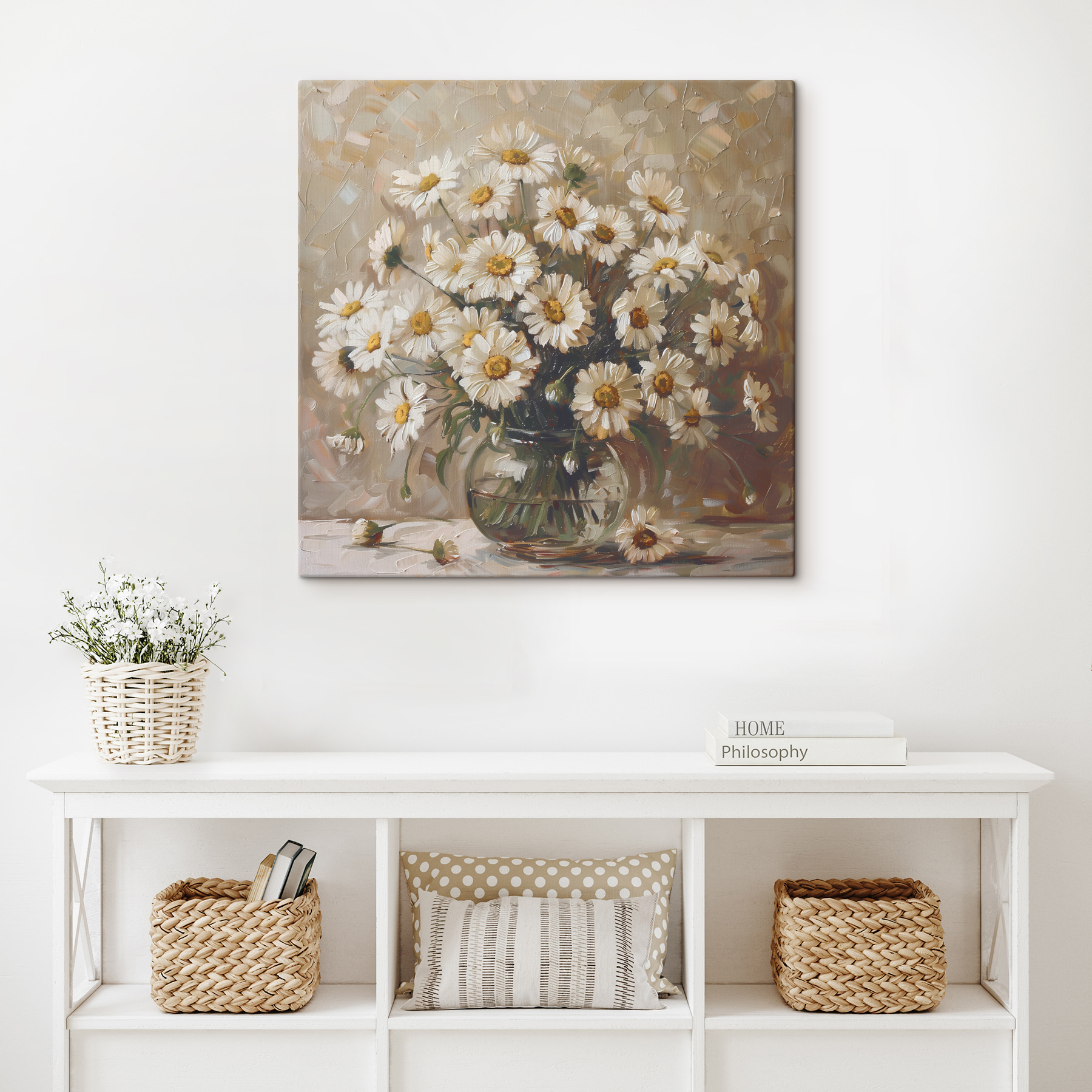 Illuminez n’importe quelle pièce avec cette charmante impression sur toile représentant un ravissant bouquet de marguerites dans un vase en verre. Imaginez que vous entrez dans un espace où ces fleurs joyeuses suscitent la joie dès que vous posez les yeux dessus. C’est comme si vous aviez un petit morceau de nature chez vous, qui vous chuchote des mots doux de chaleur et de fraîcheur. Parfaite pour ajouter une touche de vie à un coin lecture confortable ou à une cuisine ensoleillée, cette œuvre d’art invite au sourire et à la rêverie. De plus, les marguerites ont quelque chose de spécial – elles rappellent les journées ensoleillées et les moments d’insouciance, n’est-ce pas ? Qu’il s’agisse d’un cadeau ou d’une gâterie pour vous-même, il ne manquera pas de faire chavirer les cœurs.