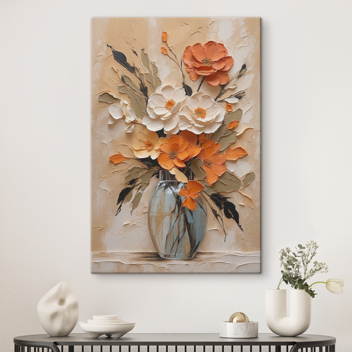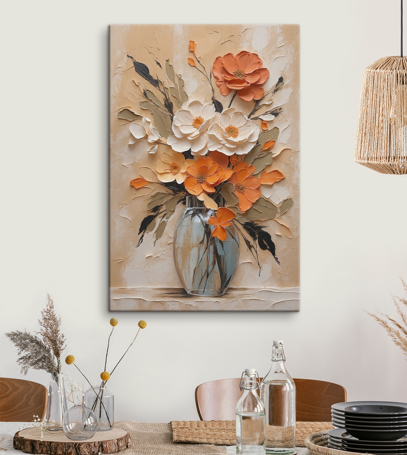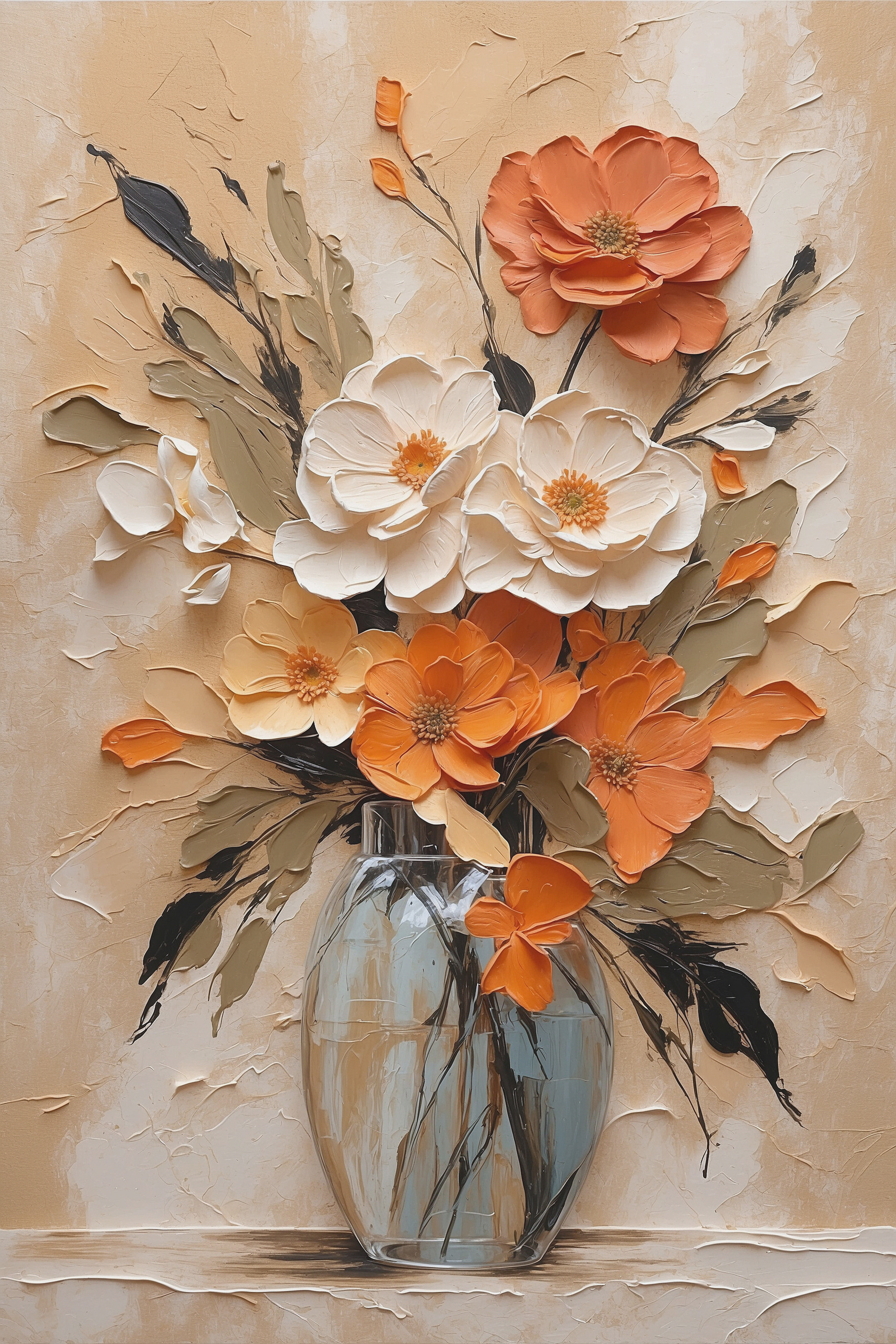 Imaginez que vous entrez dans votre salon et que vous êtes accueilli par une explosion de couleurs aussi rafraîchissante qu’un matin de printemps. Cette “peinture de fleurs dans un vase” n’est pas seulement une œuvre d’art, c’est aussi une personnalité qui attend d’égayer votre espace. Les oranges audacieux et les blancs doux se mêlent comme de vieux amis, offrant à la fois chaleur et élégance. Imaginez : un lundi maussade, vous sirotez votre café, jetez un coup d’œil à ce chef-d’œuvre et voilà, votre humeur s’en trouve immédiatement rehaussée. C’est comme un bouquet qui ne se fane jamais et qui ne cesse d’encourager vos bonnes vibrations. Parfait pour un mur qui a besoin d’un peu plus de joie.