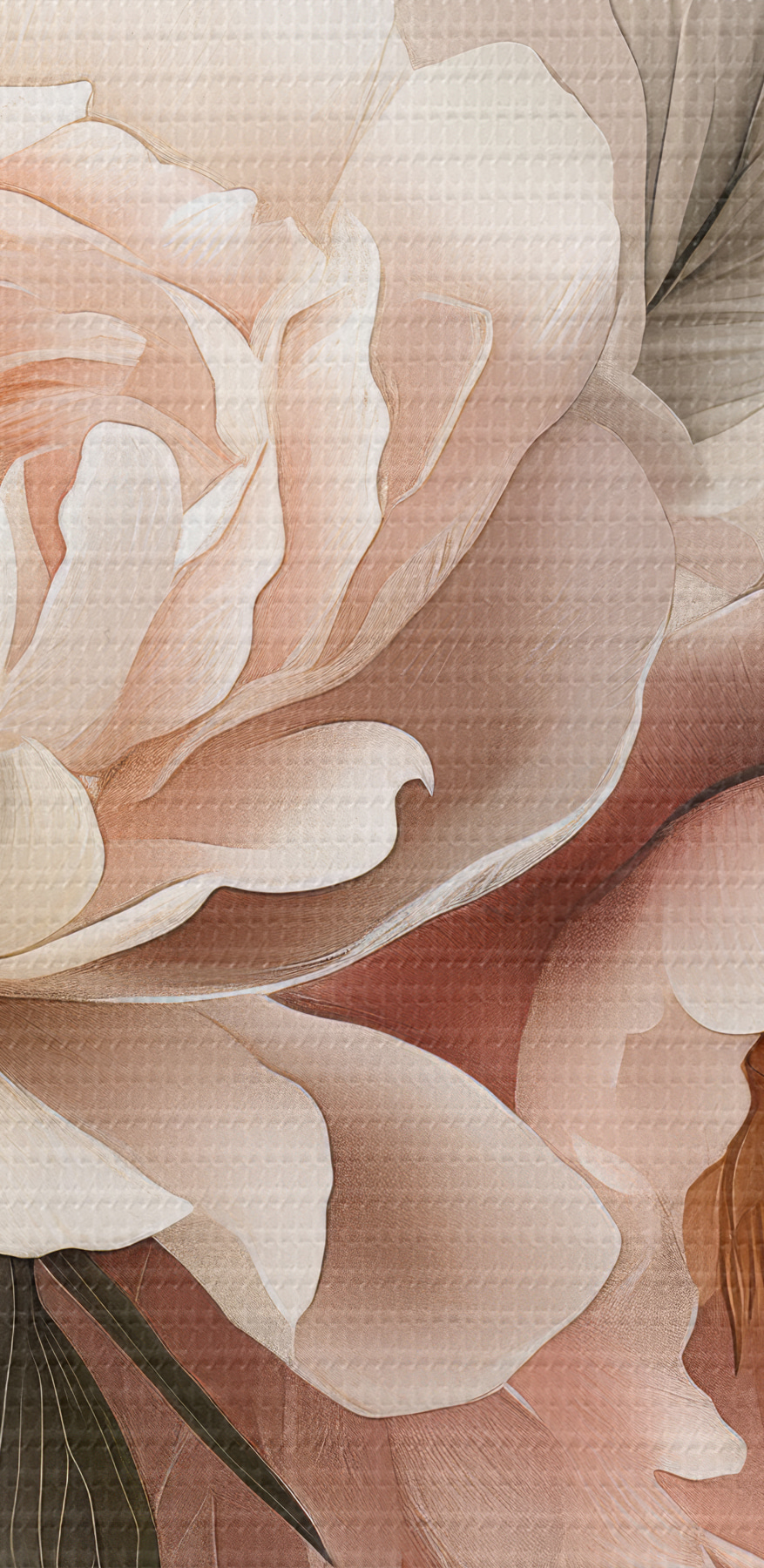 Le revêtement vinylique est une fine couche de PVC appliquée sur un support intissé. La présence de vinyle rend le papier peint résistant aux dommages, permet un nettoyage facile à l’aide d’une éponge humide et donne à la surface une texture gaufrée, ressemblant à un tissu de lin.