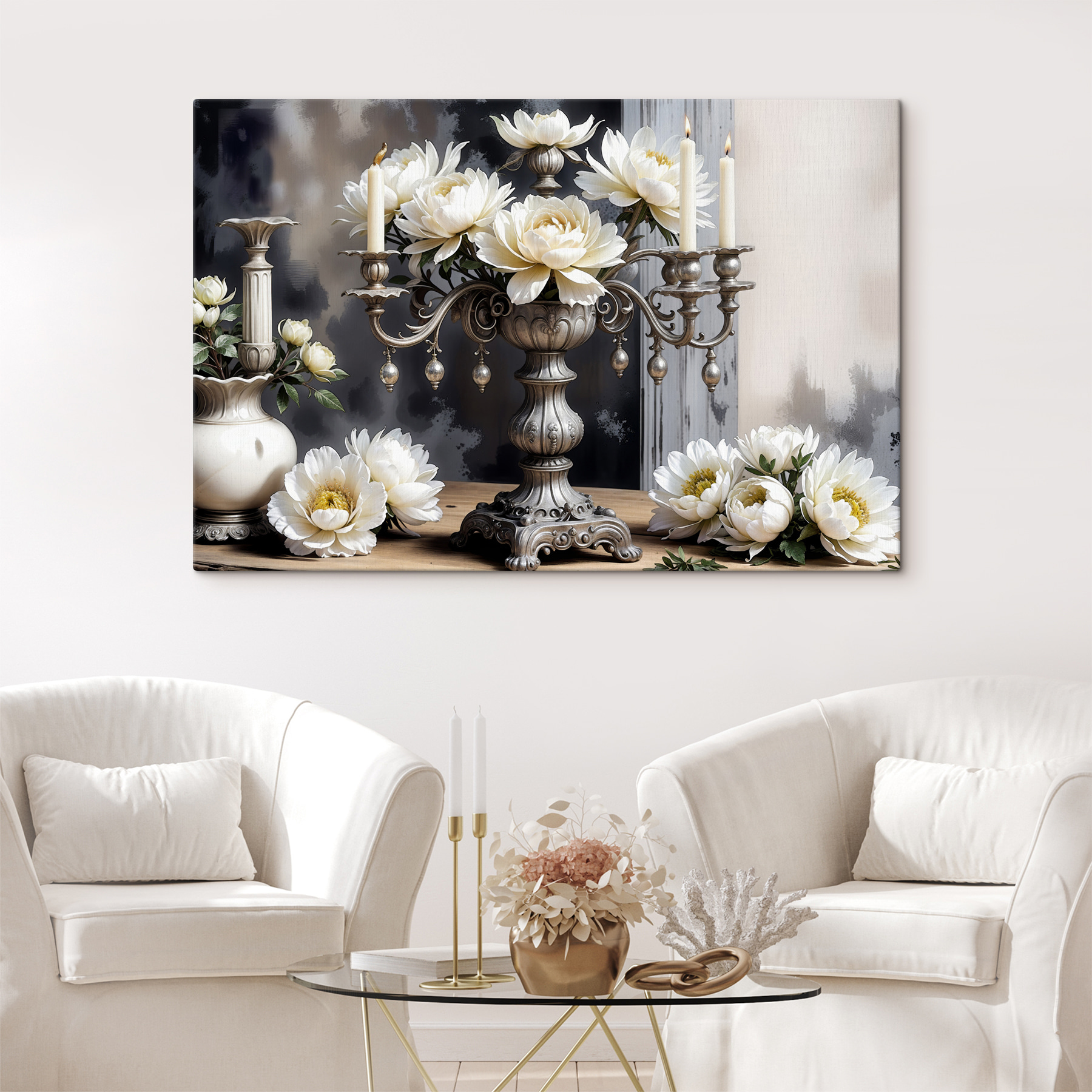 Imaginez que vous entrez dans une pièce confortable et que vous vous sentez immédiatement accueilli par le charme de cette impression sur toile. Elle représente un superbe candélabre entouré de fleurs blanches et douces. Parfait pour ajouter de la chaleur, c’est comme inviter un ami à prendre le thé, même si vous êtes seul. Cette scène élégante évoque des dîners aux chandelles et des réunions joyeuses. Elle serait fabuleuse au-dessus d’une cheminée ou même dans une salle à manger, apportant une touche de grâce sans être trop formelle. Chaque coup d’œil peut susciter un peu de joie, vous rappelant que la beauté est partout, même dans les jours les plus ordinaires.