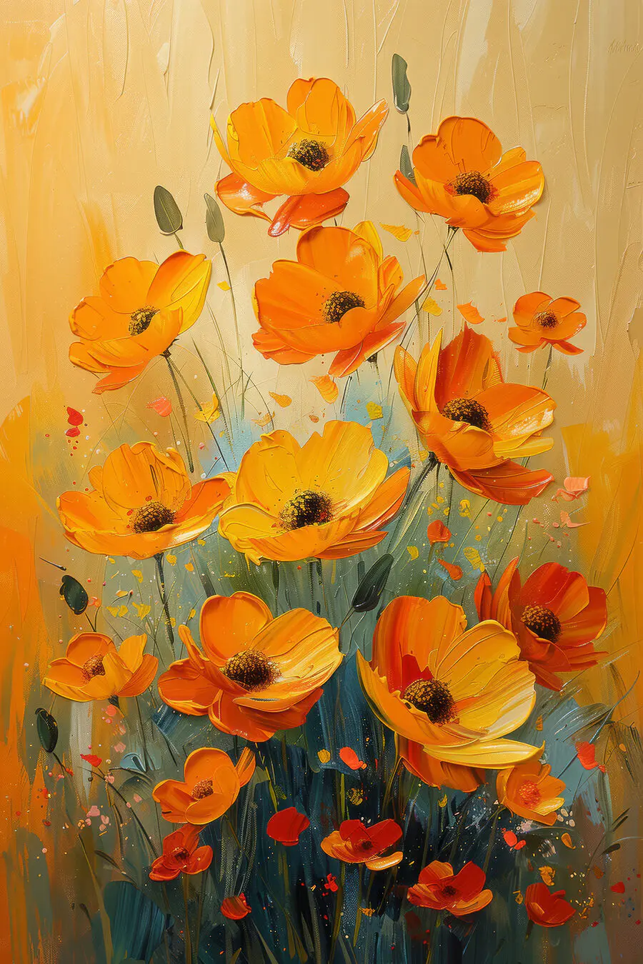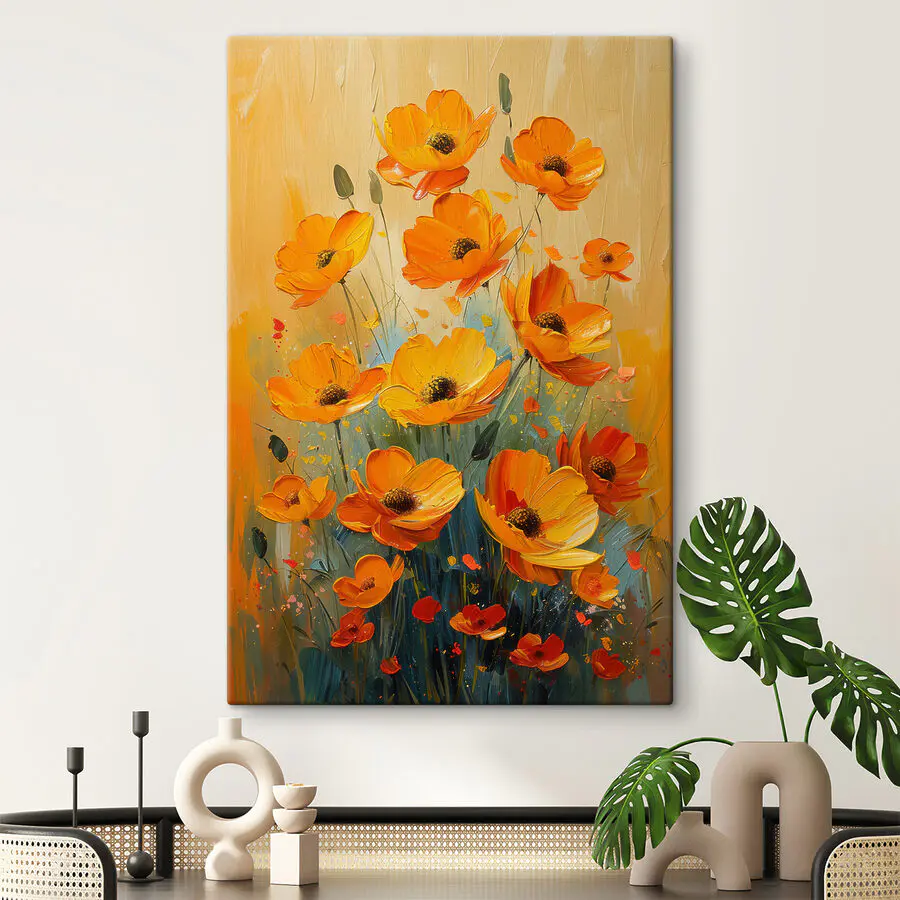 Illuminez n’importe quelle pièce avec cette impression sur toile pleine de vie représentant de superbes fleurs débordant de couleurs ! Imaginez que vous entrez dans votre espace et que vous vous sentez immédiatement stimulé par cette œuvre d’art joyeuse – c’est comme une fête de jardin sur votre mur. Les fleurs enjouées, les éclaboussures d’orange et de jaune sur une toile de fond douce, invitent à la chaleur et à la joie. Cette œuvre est parfaite pour les coins douillets ou pour apporter de la joie dans un espace de travail. Vous pourriez même vous surprendre à sourire à chaque fois que vous passez devant. Qui ne voudrait pas d’un peu de bonheur de la nature à l’intérieur ? C’est une façon simple d’apporter une bouffée d’air frais à votre décor !