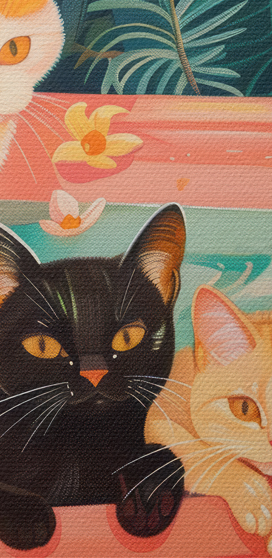 Ajoutez une touche de fun à n’importe quel espace avec “Cats in a Tub of Water” (Chats dans un bain d’eau). Cette charmante impression sur toile capture l’esprit insouciant de quatre amis félins se prélassant dans une baignoire vibrante entourée de plantes tropicales luxuriantes. C’est comme une mini-vacance pour vos murs, invitant des sourires et des souvenirs chaleureux. Imaginez que vous entrez dans votre pièce et que vous vous sentez instantanément revigoré par leurs jeux. Parfaite pour les amoureux des chats ou pour tous ceux qui apprécient les décors originaux, cette pièce apporte une délicieuse touche de fantaisie à votre intérieur. Qui ne voudrait pas partager un moment avec ces adorables boules de poils ?