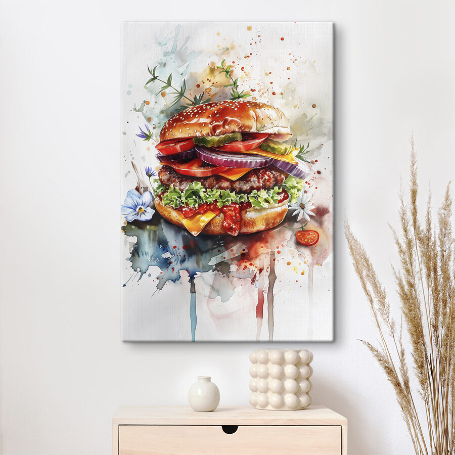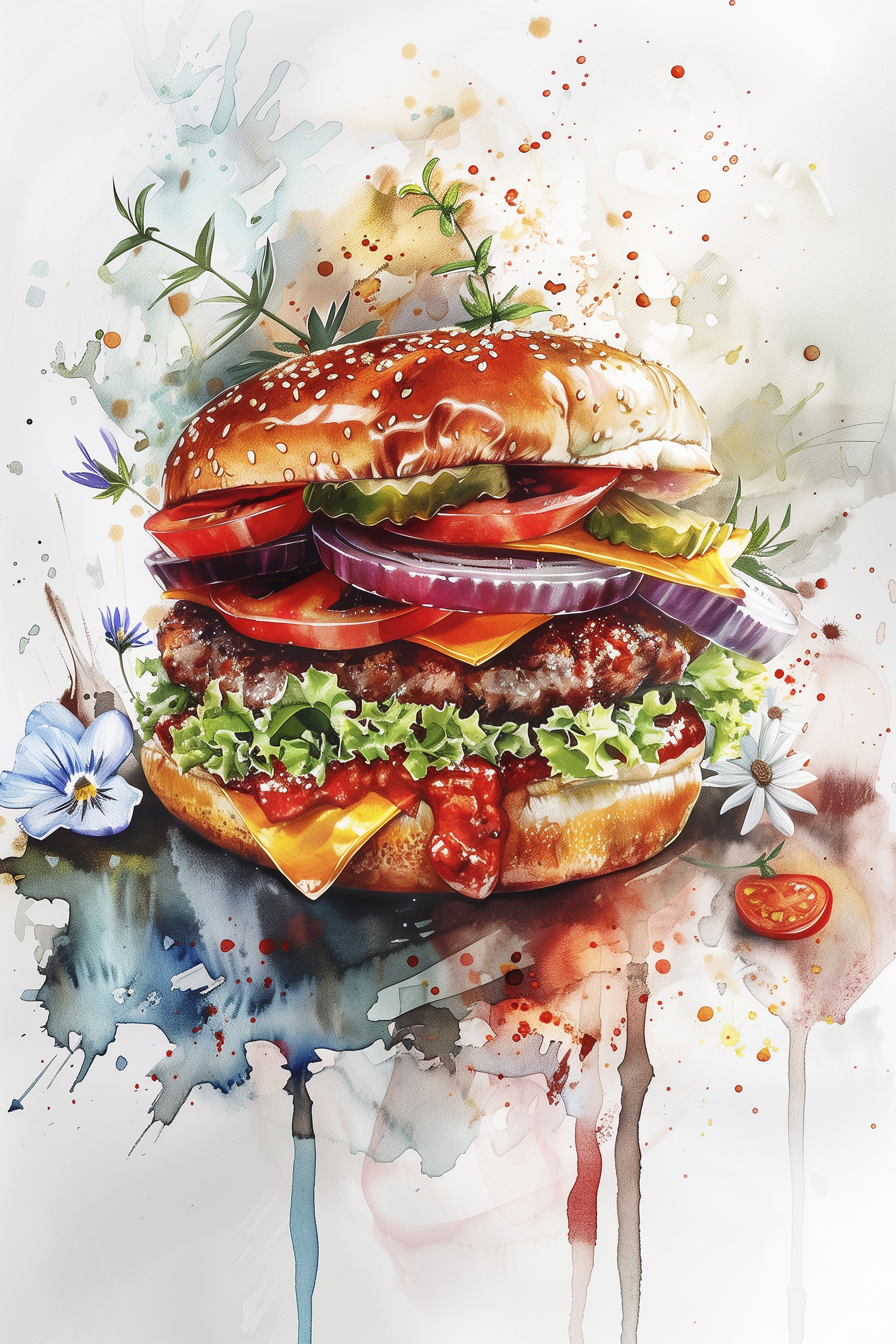 Voici une œuvre d’art qui donnera faim aux murs de votre cuisine ! Voici “Impressions sur toile s39699” – un régal pour les yeux et un sujet de conversation amusant pour vos amis gourmands. Imaginez ce chef-d’œuvre vibrant de cheeseburger suspendu au-dessus de votre table à manger, ajoutant une touche de couleur et de fantaisie à chaque repas. La technique de l’aquarelle lui confère une qualité de rêve, presque juteuse – vous pouvez pratiquement goûter la fraîcheur de la laitue, le piquant des cornichons, et oooh ce fromage fondant…