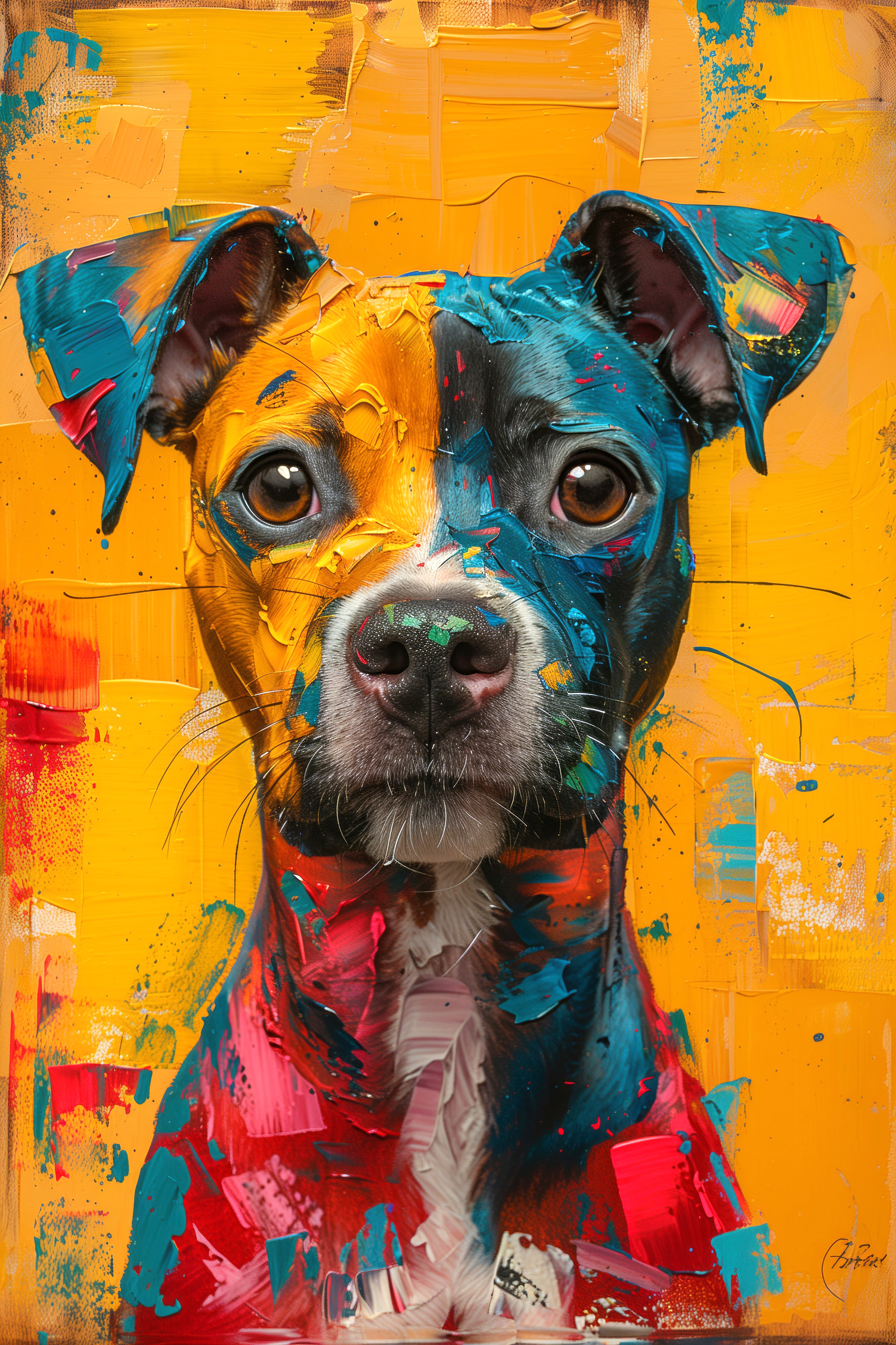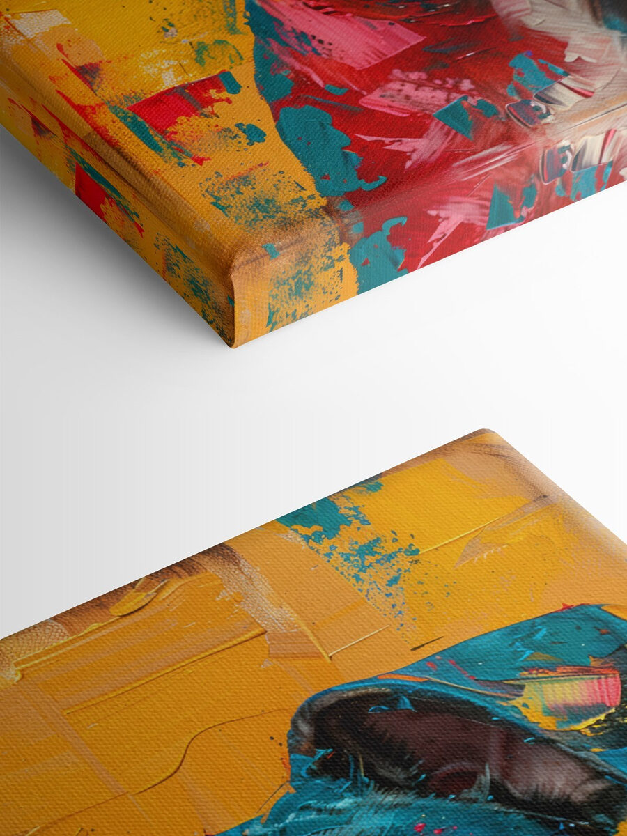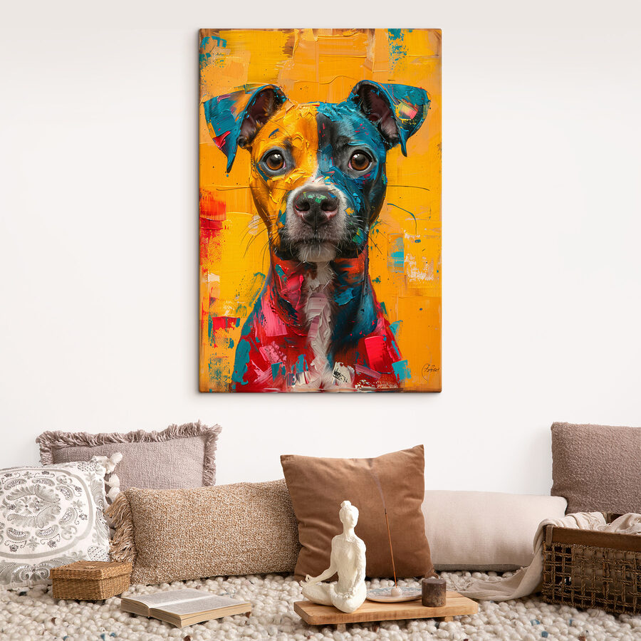 Si l’ambiance de votre espace a besoin d’un coup de fouet ou d’un sujet de conversation, cet imprimé est fait pour vous. Les couleurs vives – rouges, bleus, jaunes – dansent ensemble et font ressortir l’esprit enjoué du chien. Il est parfait pour les amoureux des animaux, les passionnés d’art ou tous ceux qui ont besoin d’une petite étincelle de joie supplémentaire dans leur maison. Cette œuvre ne se contente pas d’être accrochée au mur, elle fait partie de votre journée, de votre histoire.