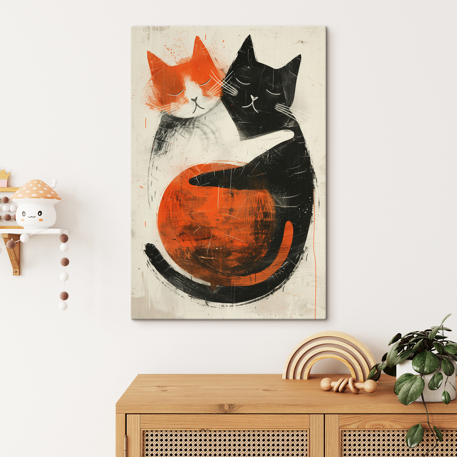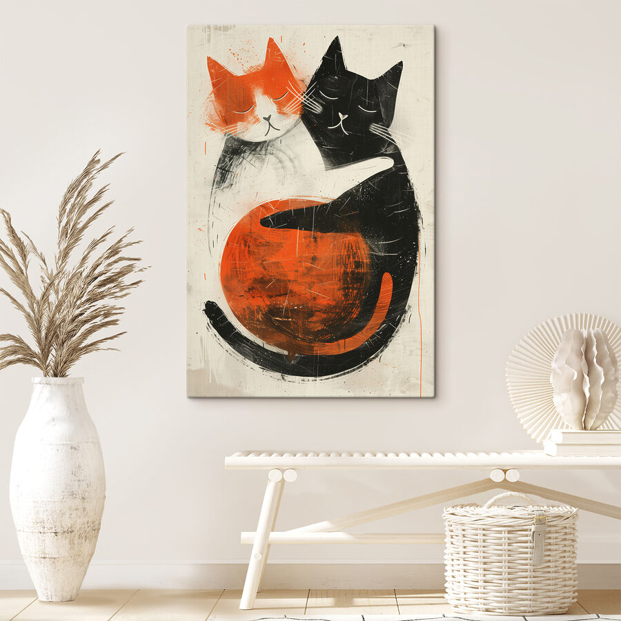 Cette œuvre d’art a sa place partout, du salon au coin du lit. Il a un style cool, presque rétro, mélangeant des oranges vifs et des noirs profonds pour créer une sensation de chaleur et d’accueil. Imaginez que vous rentriez chez vous après une longue journée – voir ces jolis visages pourrait certainement faire fondre le stress. C’est comme si vous receviez un mini-câlin sur la toile ! Facile à aimer et encore plus facile à intégrer dans votre décor existant, il s’adresse aussi bien aux amateurs d’art qu’aux passionnés de chats. Alors, donnez à vos murs une raison de sourire !