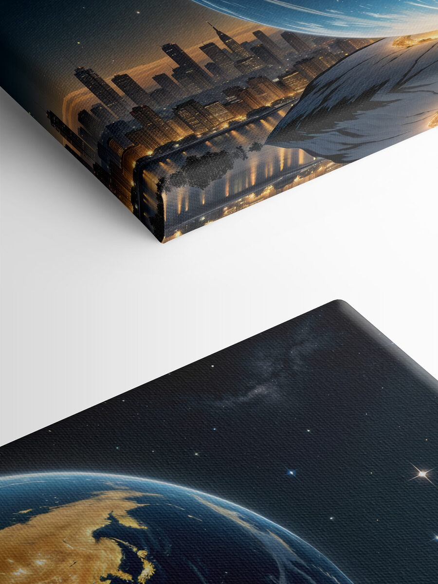 Parfait pour ajouter une touche de sophistication et un soupçon de fantaisie à n’importe quelle pièce, qu’il s’agisse du salon, du bureau ou même d’un coin de café confortable. Imaginez un peu : Vous vous prélassez sur votre canapé, sirotez un café et contemplez les merveilles de l’univers. C’est comme un stimulant instantané de l’humeur ! De plus, le mélange magique de la ligne d’horizon de la ville et de la beauté céleste suscitera des conversations et peut-être même un peu de rêverie.