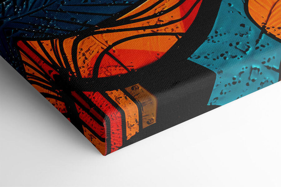 Imaginez que vous rentriez chez vous après une longue journée, que vous vous installiez confortablement dans votre canapé et que vous voyiez cette œuvre vivante sur votre mur… C’est comme un remontant visuel. Le mélange des couleurs – bleu, orange, rouge – fait sensation, n’est-ce pas ? C’est un peu comme si vous entriez dans une galerie d’art moderne et funky, sauf qu’elle se trouve dans votre salon.