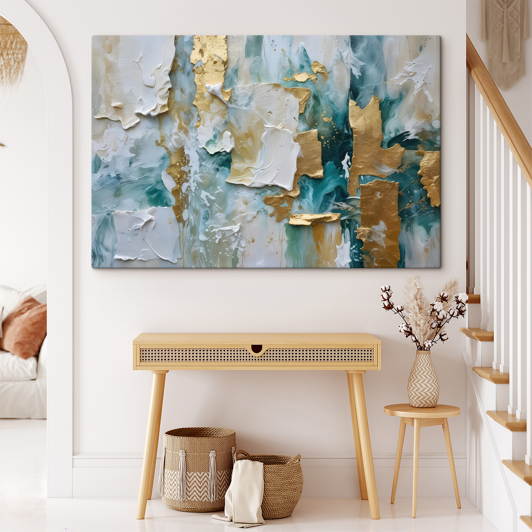 Transformez votre espace avec “l’élégance abstraite en crème et sarcelle”. Imaginez ceci : de douces couches de teintes crème se mêlant à la sarcelle vibrante, créant une scène apaisante mais accrocheuse. C’est comme une douce vague qui déferle sur vos murs, invitant au calme dans votre journée. Imaginez que vous vous réunissez avec des amis et que leurs yeux s’illuminent en admirant cette pièce unique. Elle ajoute une touche de caractère sans attirer l’attention, ce qui est parfait pour un coin confortable ou comme point focal. Cette toile n’est pas seulement un objet d’art, c’est aussi un sujet de conversation qui apporte chaleur et inspiration dans n’importe quelle pièce. Il suffit de l’accrocher, de se détendre et de laisser entrer les vibrations !