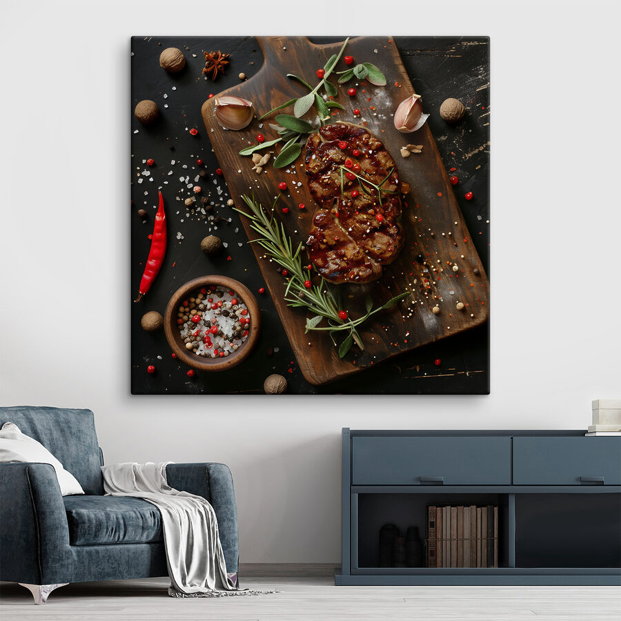 Imaginez : le confort de votre cuisine rencontre le flair artistique d’une galerie d’art. Cette impression sur toile, qui représente un morceau de viande juteux agrémenté d’épices et d’herbes, apporte une touche d’aventure culinaire à vos murs. C’est comme si la planche d’un maître cuisinier était capturée en pleine création – on entend presque le bruit du bec ! Parfait pour les gourmands ou tous ceux qui aiment une touche de charme rustique. Accrochez-le et il pourrait bien inspirer votre prochaine expérience gastronomique, ou du moins vous donner envie d’un bon steak. Un décor délicieux, ça vous dit ?